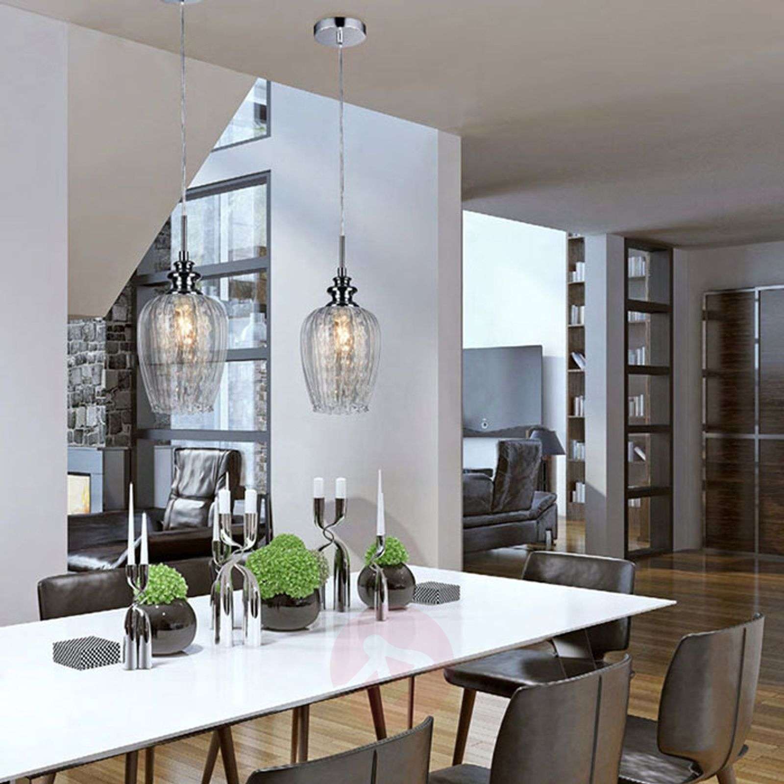 Wyjątkowo elegancka lampa wisząca Blues Dowodem na to, jak niepowtarzalny efekt świetlny można uzyskać za pomocą tylko jednego szklanego klosza, jest nasza elegancka lampa wisząca Blues. Na smukłym zawieszeniu w kolorze niklu zamocowano otwarty ku dołowi wąski klosz z delikatnie pofalowanego szkła hutniczego Na pierwszy rzut oka niemal nie zauważa się, że wnętrze szklanego klosza ozdobiono migoczącymi łańcuszkami z ośmiokątnych kryształków, które osłaniają żarówkę i jednocześnie rozbłyskują refleksami po jej włączeniu. Zawieszona nad stołem w kuchni czy pokoju dziennym lampa Blues awansuje do oświetlenia szczególnego rodzaju. Klasa efektywności energetycznej: A++