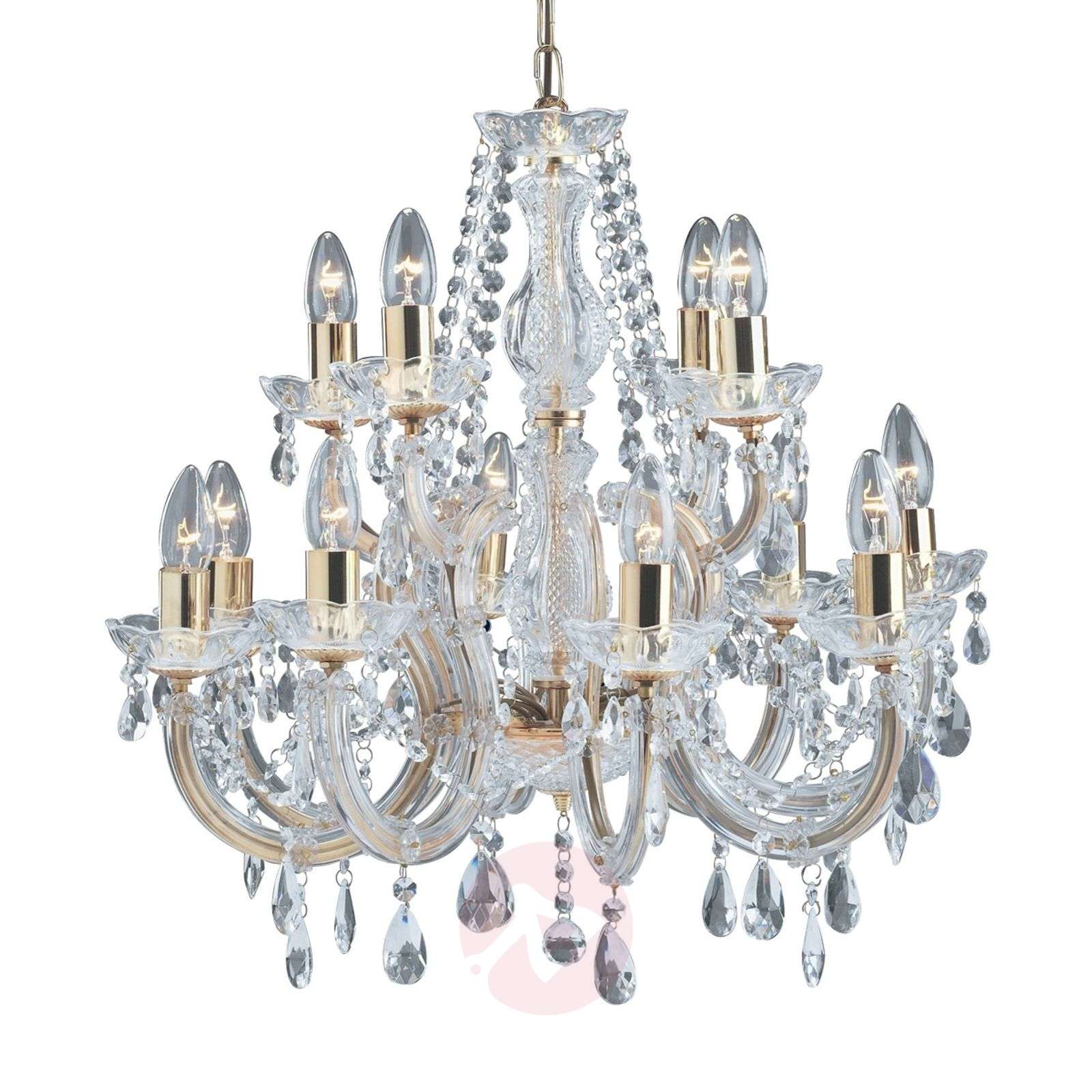 Żyrandol MARIE THERESE z polerowanego mosiądzu jako wytworna dekoracja Żyrandol MARIE THERESE odznacza się klasycznym designem. Zdobią go liczne detale w postaci oszlifowanych, szklanych kryształów, które zwisają z elegancko wygiętych ramion ze szkła kryształowego. Błyszczące, miedziane elementy dopełniają całości. Wytworny żyrandol, który zapewni chwile pełne niezapomnianego blasku. Klasa efektywności energetycznej: A++