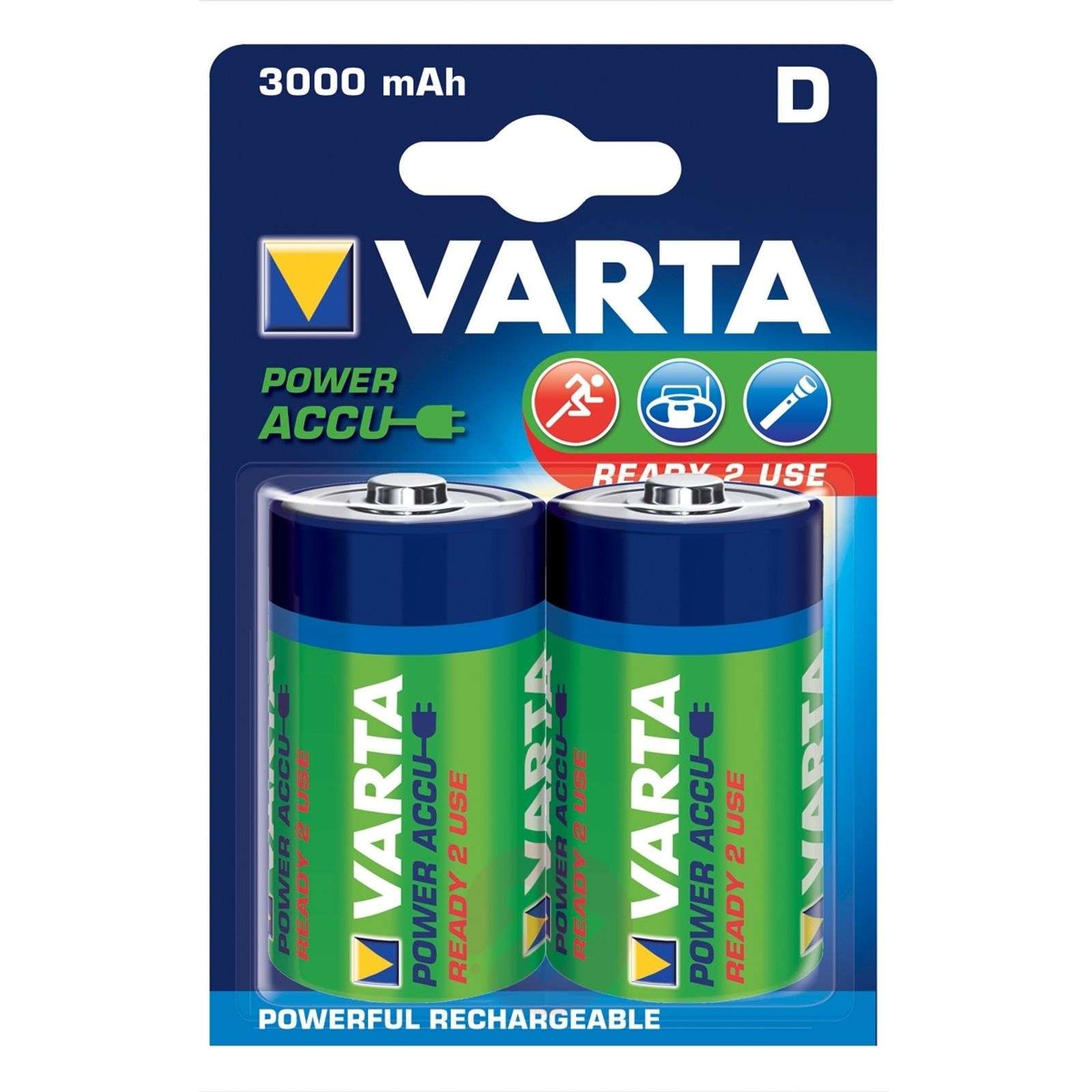 Akumulator Mono D / 56720, 1,2 V, 3000 m/Ah Varta - 2 sztuki Naładowane akumulatory można używać natychmiast po zakupie. Zapewniają wysoki komfort użytkowania. Dodatkowym walorem jest minimalna utrata mocy przy długim przechowywaniu - raz naładowane akumulatory gwarantują po roku przechowywania do 80% zawartości.