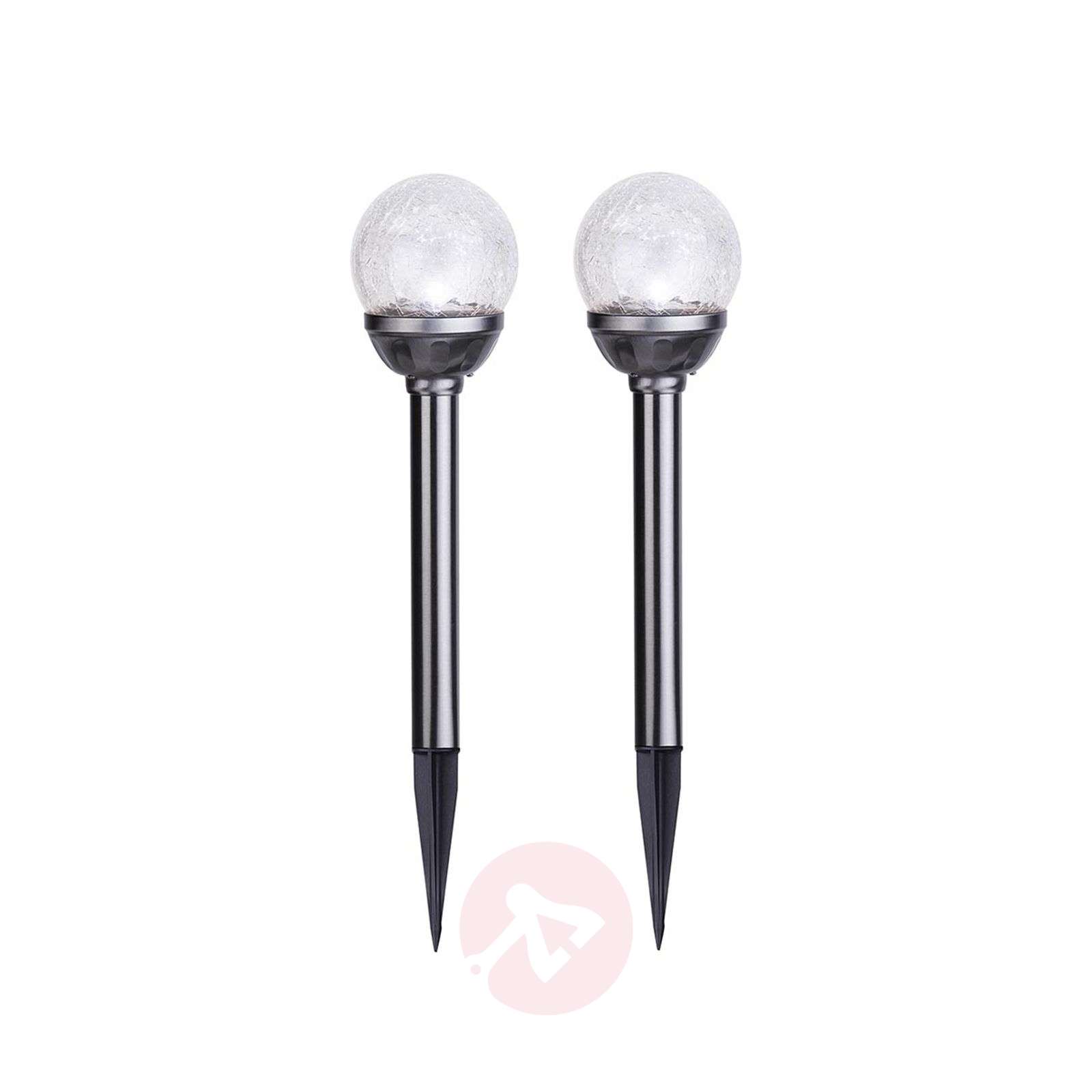 2-częściowy zestaw pałeczek solarnych z kulami Lampy solarne stworzą wieczorem nastrojową atmosferę w ogrodzie. Każda pałeczka składa się ze szklanej kuli, sprawiającej wrażenie pękniętego szkła, drążka oraz panelu słonecznego (wewnątrz kuli), który w ciągu dnia ładuje baterie tak, aby po zmierzchu były one zaopatrzone w energię. Zestaw wyposażony jest w czujnik zmierzchu. - każda pałeczka zawiera 1 akumulatorek AA Ni-MH 1,2V 400 mAh Klasa efektywności energetycznej: A+