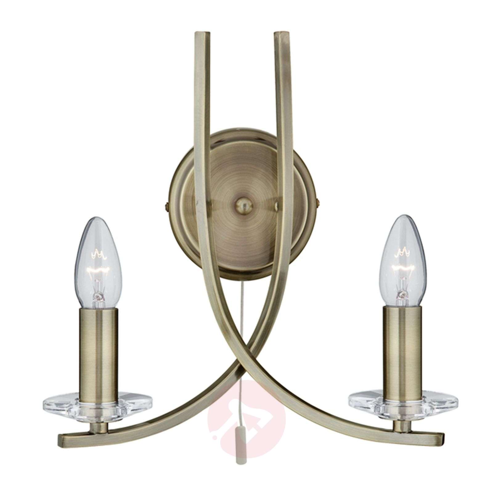 Piękna, dwupunktowa lampa ścienna Ascona w kolorze starego mosiądzu Choć projekt lampy ściennej Ascona cechuje się prostotą, jest bardzo atrakcyjny i natychmiast wpada w oko. Na oprawę lampy składają się okrągły uchwyt ścienny i zamocowane na nim, w niewielkiej odległości od jego powierzchni, dwa zaokrąglone, skrzyżowane, metalowe ramiona w kolorze starego mosiądzu. Do osadzonych na ramionach oprawek o lichtarzowej formie z przezroczystymi podstawkami pasować będą równie transparentne źródła światła w kształcie wydłużonych baniek, które wraz z oprawkami złożą się na wizualny efekt świec. Klasa efektywności energetycznej: A++