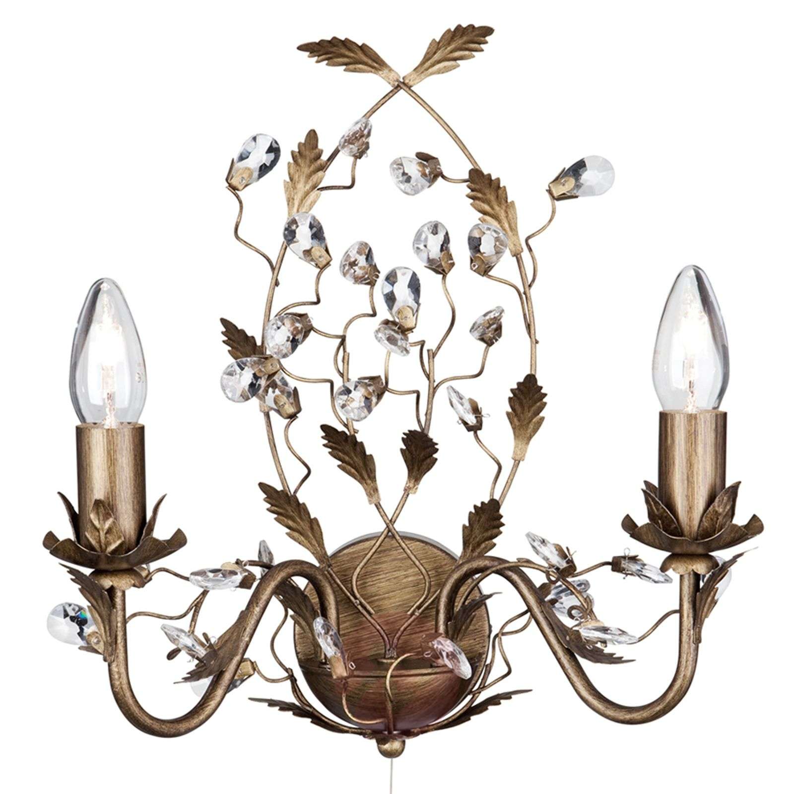 Czarująca, dwupunktowa lampa ścienna Almandite, ozdobiona kryształami Bajecznie piękna lampa ścienna Almandite odmieni wygląd najzwyklejszej ściany. Odchodzące w górę ze ściennego uchwytu ozdobne „pnącza” zakończone są „pąkami”, w których osadzono szklane kryształy. Na kunsztownie wygiętych do boków ramionach oprawy w złoto-mosiężnym kolorze umieszczono źródła światła w oprawkach E14. Całość pięknie lśni jeszcze przed włączeniem lampy. Po włączeniu – za pomocą przełącznika wyciąganego – Almandite roztacza szlachetny blask. Ten model z kwiatowym motywem jest wzorowany na lampach ściennych w stylu florenckim. Klasa efektywności energetycznej: A++