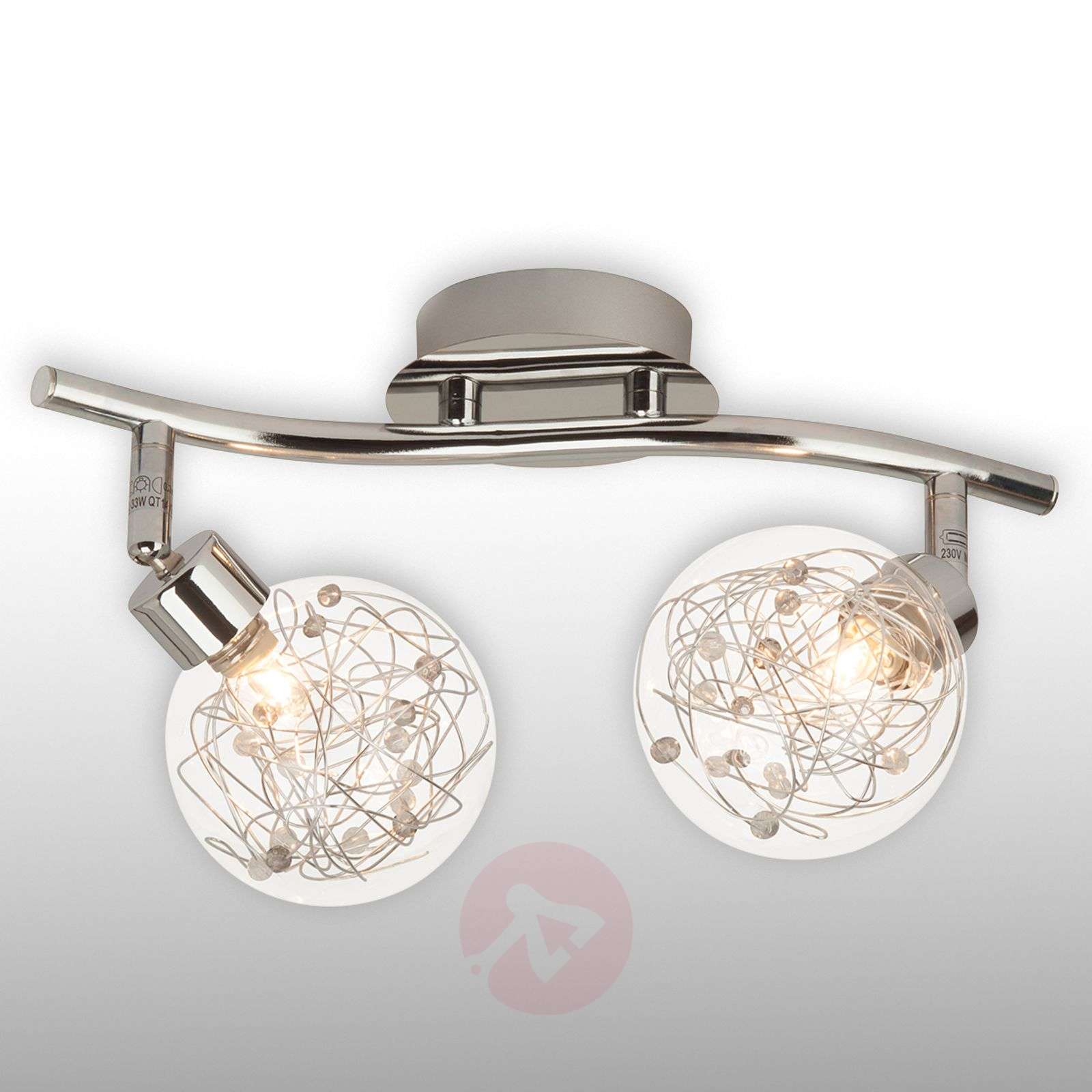 2-punktowa lampa sufitowa JOYA z efektownymi kloszami Na lekko wygiętym zamocowaniu sufitowym umieszczone są dwa efektowne klosze z przezroczystego szkła ozdobione wewnątrz metalową plecionką oraz szklanymi dekoracjami o czerwonawym połysku. Można je regulować za pomocą przegubów na zamocowaniu. Lampa JOYA przystosowana jest do lamp halogenowych G9, za pomocą których wyczaruje we wnętrzu wyjątkowe niezwykłe efekty świetlne. (Żarówki proszę zamówić osobno - patrz akcesoria). Klasa efektywności energetycznej: A++