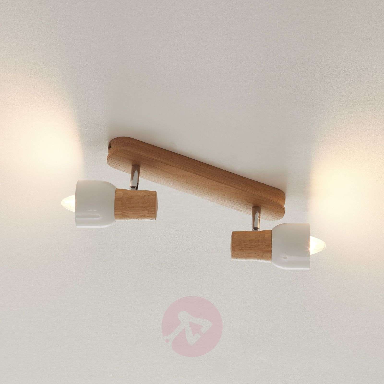 2-punktowa lampa sufitowa Svantje z naturalnym drewnianym designem Dwa klosze lampy sufitowej Svantje można regulować pod dowolnym kątem, tak aby światło skierowane zostało dokładnie tam, gdzie powinno się znaleźć. Jednak design tej lampy mówi również sam za siebie, ponieważ połączenie olejowanych dębowych elementów klosza i mocowania sufitowego z metalowymi elementami w matowej bieli i błyszczącym chromie nadaje tej lampie równie nowoczesny i naturalny wygląd, dzięki czemu z pewnością przyciągnie ona wzrok. Klasa efektywności energetycznej: A++