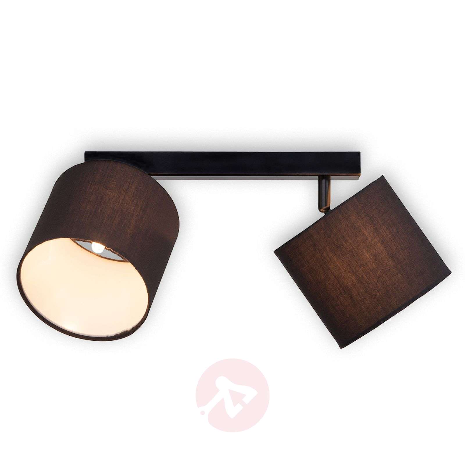 Lampa sufitowa SANDRA z dwoma regulowanymi abażurami z materiału Dwupunktowa lampa sufitowa SANDRA jest cała utrzymana w stylu retro. Zarówno pokryta czarnym, matowym lakierem oprawa, jak i abażury odznaczają się prostym designem. Brązowe abażury z białym wnętrzem są regulowane w miejscu oprawy. SANDRA może służyć również jako lampa ścienna. Dwie lampy halogenowe o mocy do 40 W zapewnią lśniące światło (nie zawarte w zestawie - patrz „Akcesoria dodatkowe”), które przedostając się jasną wiązką przez materiałowe abażury tworzy na zewnątrz łagodną poświatę. Klasa efektywności energetycznej: A++
