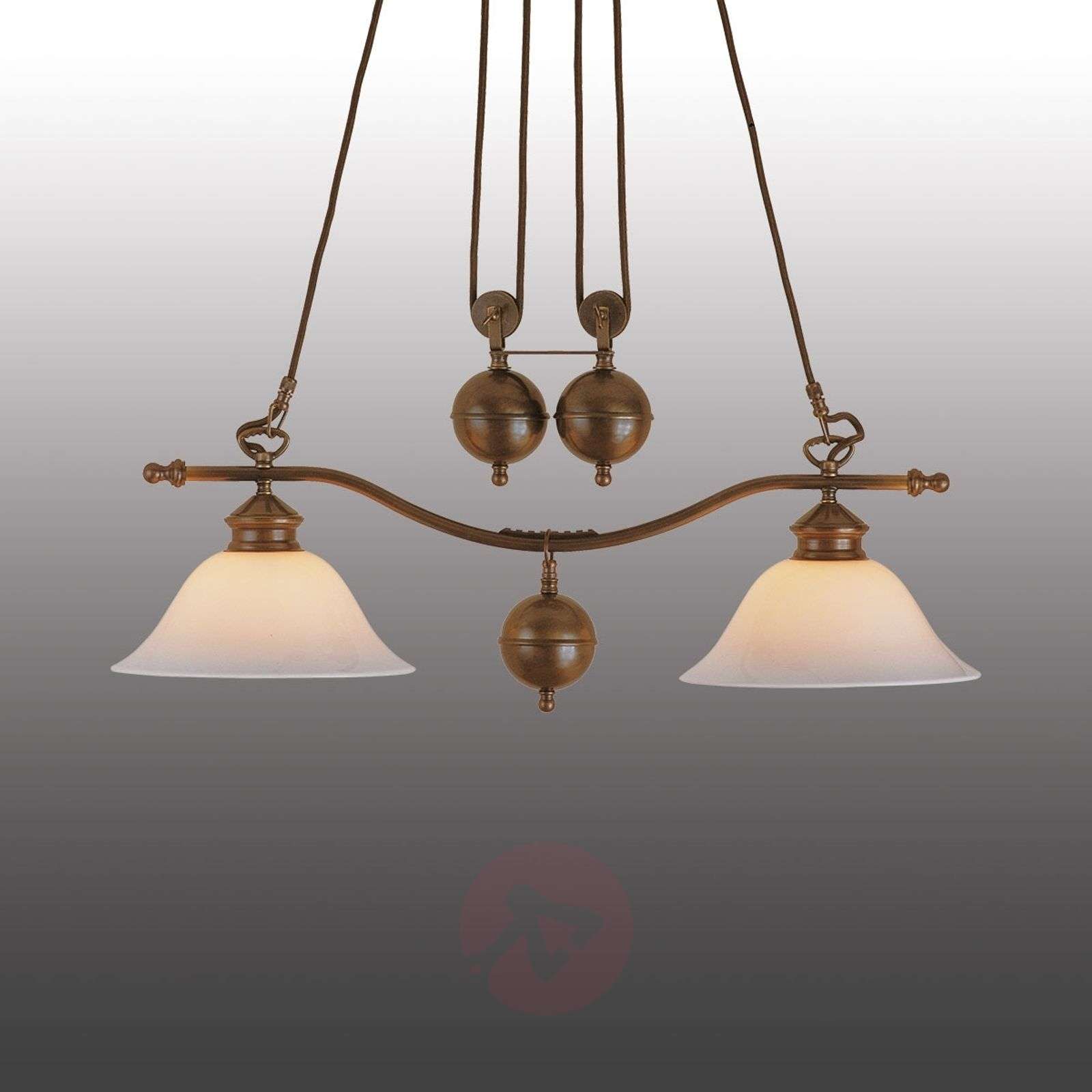 Lampa wisząca Anno 1900 z kloszami ze szkła mlecznego Triplex z podwójną linką Lampa wisząca ANNO 1900 zapewnia nastrojowe światło, pozwalające np. na iluminację dużych stołów. To piękne źródło światła ma powierzchnię z brązowanego mosiądzu; dwa klosze wykonane zostały z wygiętego, kilkuwarstwowego szkła mlecznego, tzw. Triplex, które zapewnia miękkie, przyjemne światło. Wysokość lampy można regulować podwójną linką. Te wysokiej jakości, wyprodukowane w Europie lampy, są wykonane ręcznie z naturalnych materiałów i wyróżniają się bardzo wysoką jakością. Niewielki nakład produkcji pozwala na zachowanie indywidualności, różnorodności i wyjątkowości produktów. Klasa efektywności energetycznej: A++