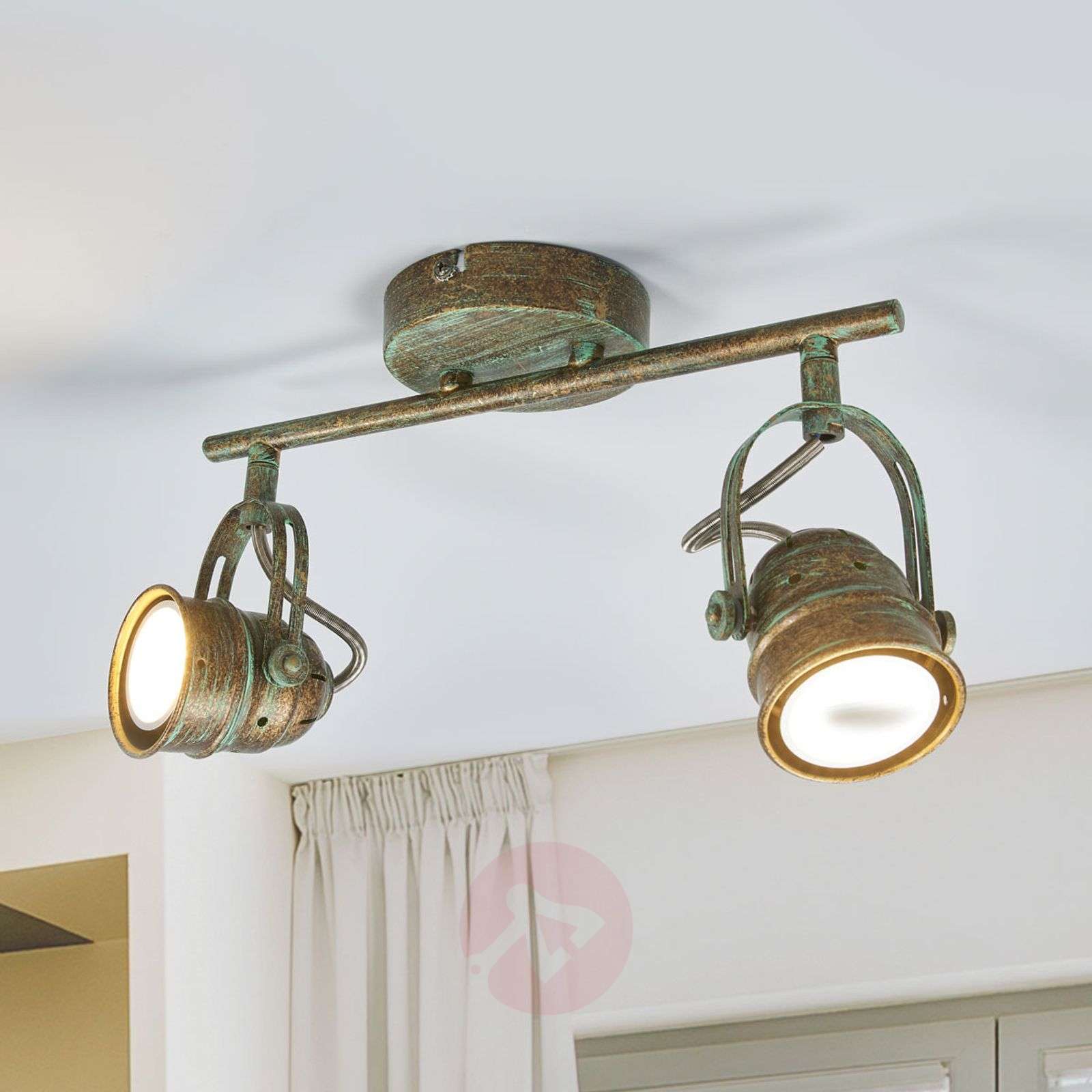 Reflektor LED Leonor w stylu retro, z ruchomymi głowicami Reflektor Leonor wyróżnia się starodawnym wyglądem. Oba klosze z metalu mają przeguby, które umożliwiają obracanie i odchylanie w różnych kierunkach. Metal nie jest przy tym jednokolorowy: odznacza się poprzez wiele odcieni, wśród których dominuje efekt patyny. Dzięki niemu reflektor LED wygląda tak, jakby oprawa miała już wiele lat za sobą. Dlatego bardzo dobrze prezentuje się on we wnętrzach, w których dominuje starodawny klimat. Klasa efektywności energetycznej: A+