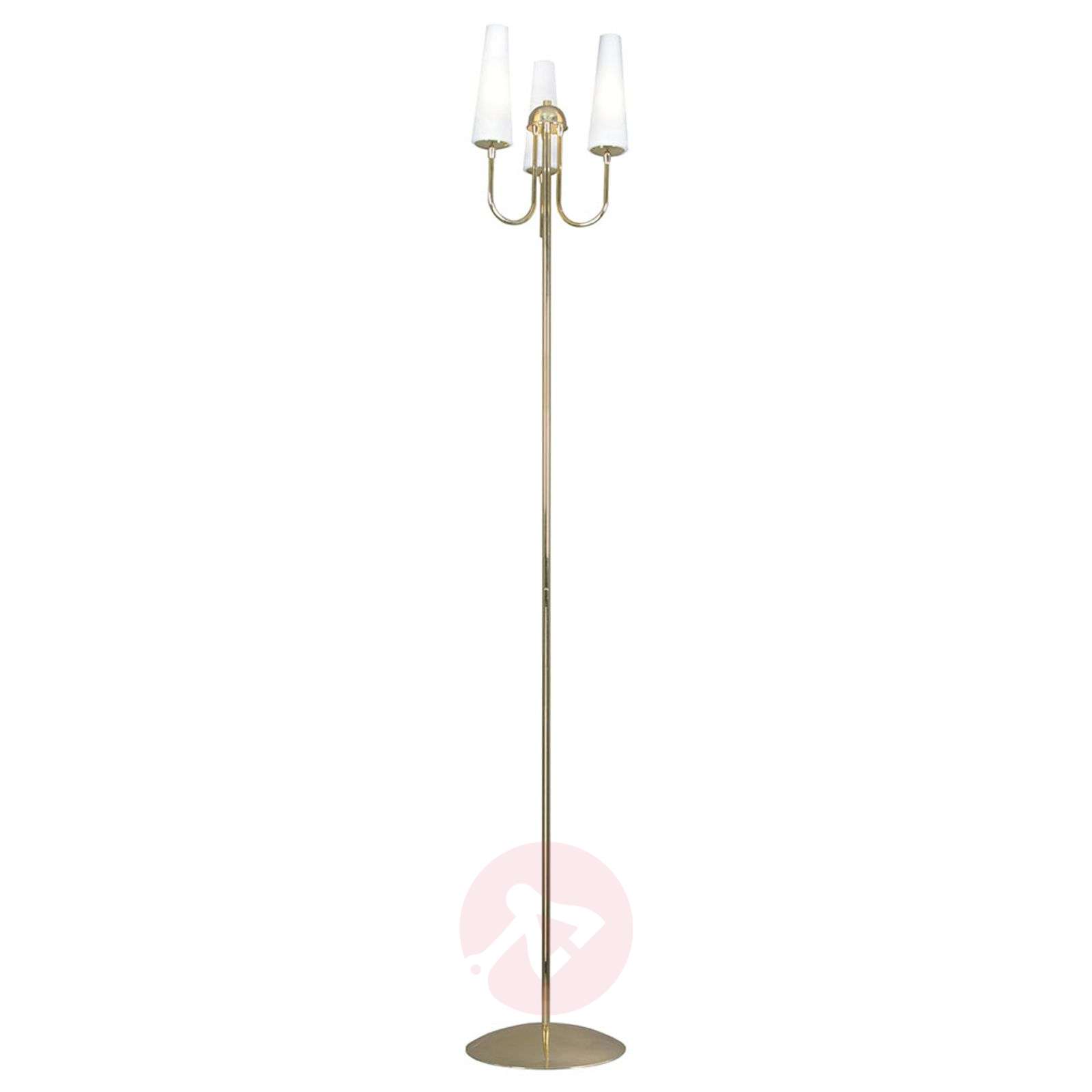 Lampa stojąca Magnum z błyszczącym złotym wykończeniem Jej dość prosta forma jest idealnie uzupełniona błyszczącą złotą powierzchnią.Nadaje to całemu obrazowi antyczny i bardzo elegancki urok, który można znaleźć przede wszystkim w klasycznie zaprojektowanych salonach. Trzy stożkowe klosze z białego szkła zapewniają harmonijne rozchodzenie się światła, które nie oślepia. Lampę stojącą Magnum można dyskretnie i elegancko wkomponować w różne wnętrza. Klasa efektywności energetycznej: A++
