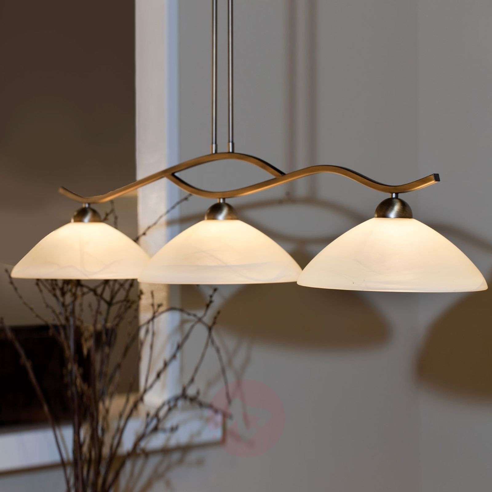Rustykalna lampa wisząca Capri 3-punktowa lampa wisząca Capri wszędzie wygląda dekoracyjnie i w wielu stylach urządzenia wnętrz stanowi ciekawą atrakcję dla oka. Metalowy korpus o pięknym kształcie utrzymano w kolorze brązu i uzupełniono o trzy kremowe szklane klosze. Klosze oferują ciepłe, stylizowane i nastrojowe oświetlenie ogólne lub stołu. Lampa Capri to rustykalny, dekoracyjny element urządzenia wnętrz, a jednocześnie skuteczna lampa wisząca. Jej wysokość można w praktyczny sposób ustawić w zakresie od 80 do 125 cm. Klasa efektywności energetycznej: A++