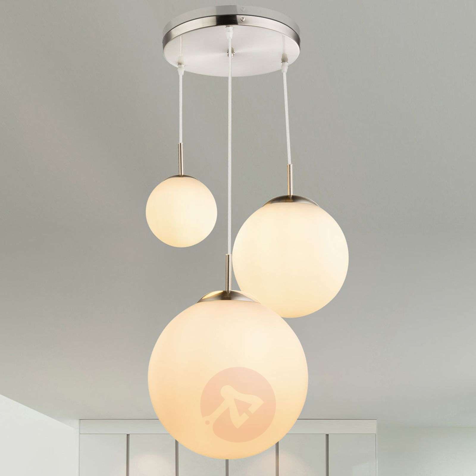 3-punktowa lampa wisząca Joel – jedność dynamiki i harmonii Trzy różnej wielkości kule o opalizującym wyglądzie sprawiają pogodne, wyważone wrażenie. Z kolei zróżnicowana wysokość zawieszenia sprawia, że lampa wisząca Joel wygląda na potężną. W sumie tworzy to dynamiczny i harmonijny wygląd. Szkło opalowe zapewnia nieoślepiające, a przy tym jasne światło, dzięki czemu 3-punktowa lampa wisząca Joel sprawdzi się jako funkcjonalne rozwiązanie oświetleniowe nawet w przestronnych pomieszczeniach. Prosty design sprawia, że lampa wisząca Joel jest szczególnie wszechstronna w użyciu. Model ten charakteryzuje się ponadczasową elegancją i z równym powodzeniem łączy się z nowoczesnymi i nieco nostalgicznymi koncepcjami wyposażenia wnętrz. Lampa wisząca Joel może być używana jako klasyczna lampa w salonie, w przestronnych kuchniach mieszkalnych, w pokoju gościnnym lub też w elegancko zaprojektowanym biurze. Klasa efektywności energetycznej: A++