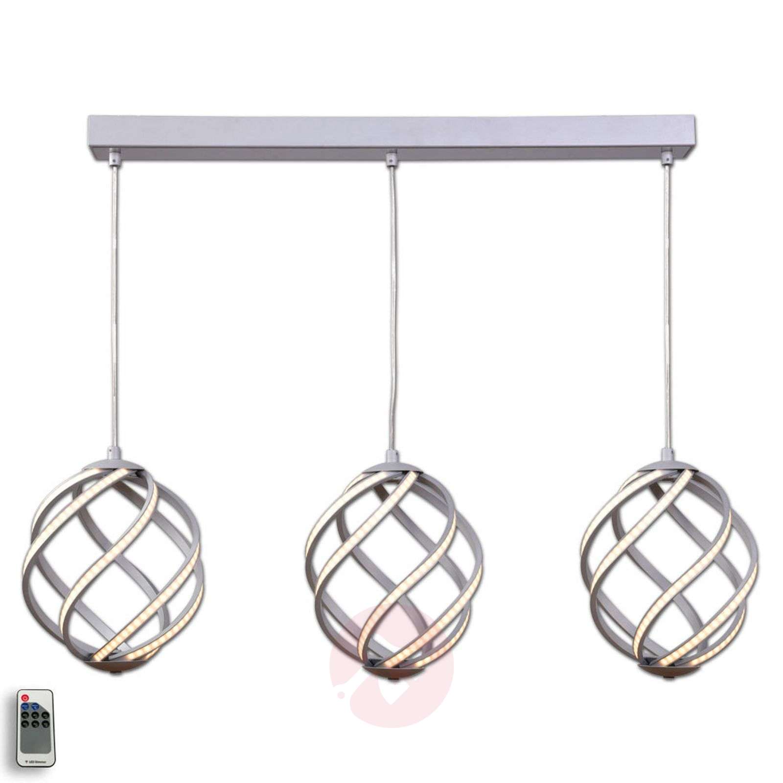 Elegancko poskręcana lampa wisząca LED Twist Trzy klosze lampy wiszącej LED Twist stanowią eleganckie i nowocześnie skręcone metalowe kule, które po zewnętrznej stronie są wyposażone w wydajne diody LED. Ukryte za dopasowanymi dyfuzorami światło diod LED o barwie ciepłej bieli przyjemnie i bez olśnień oświetla otoczenie, od razu tworząc domową atmosferę. 3-punktowa lampa wisząca idealnie sprawdza się jako solidne oświetlenie ogólne w salonie lub jadalni. Elegancki i raczej powściągliwy design zapewnia doskonałą integrację z każdym stylem wyposażenia wnętrz, natomiast energooszczędne diody LED wnoszą do każdego pomieszczenia odpowiednią jasność. Lampę wiszącą LED Twist można ściemniać wyłącznie za pomocą odpowiedniego pilota, który wchodzi w zakres dostawy. Klasa efektywności energetycznej: A+