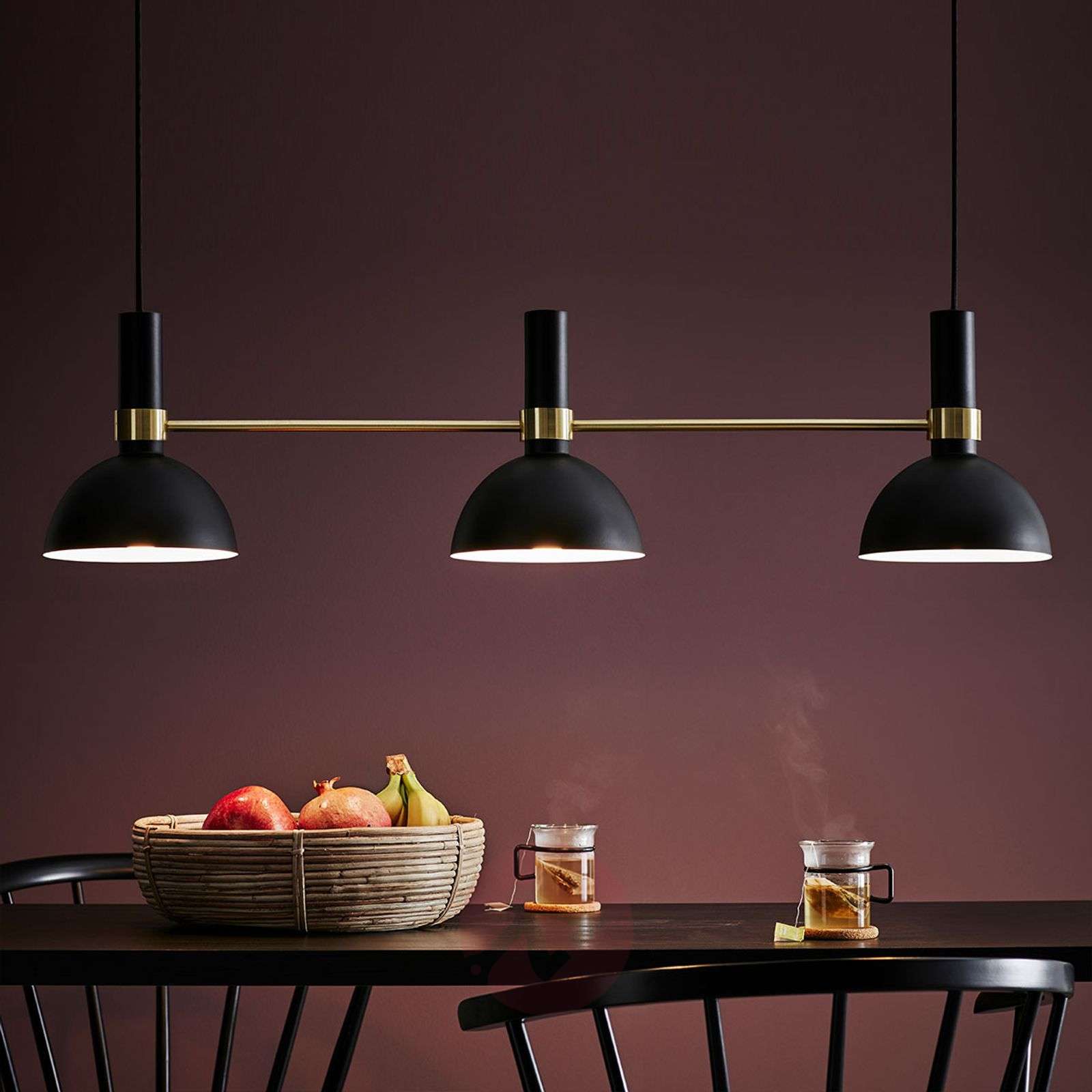 Do oświetlania stołu w jadalni: lampa wisząca Larry z trzema kloszami Półkuliste klosze lampy wiszącej Larry są wykonane z lakierowanego na czarno metalu i połączone drążkiem w kolorze mosiądzu. Połączenie czerni i mosiądzu wygląda bardzo szlachetnie i elegancko. Lampa wisząca Larry to model, który doskonale nadaje się do oświetlania stołów w salonie i jadalni. Światło jest skierowane prawie w całości ku dołowi – idealne rozwiązanie do optymalnego oświetlania stołu. Klasa efektywności energetycznej: A++