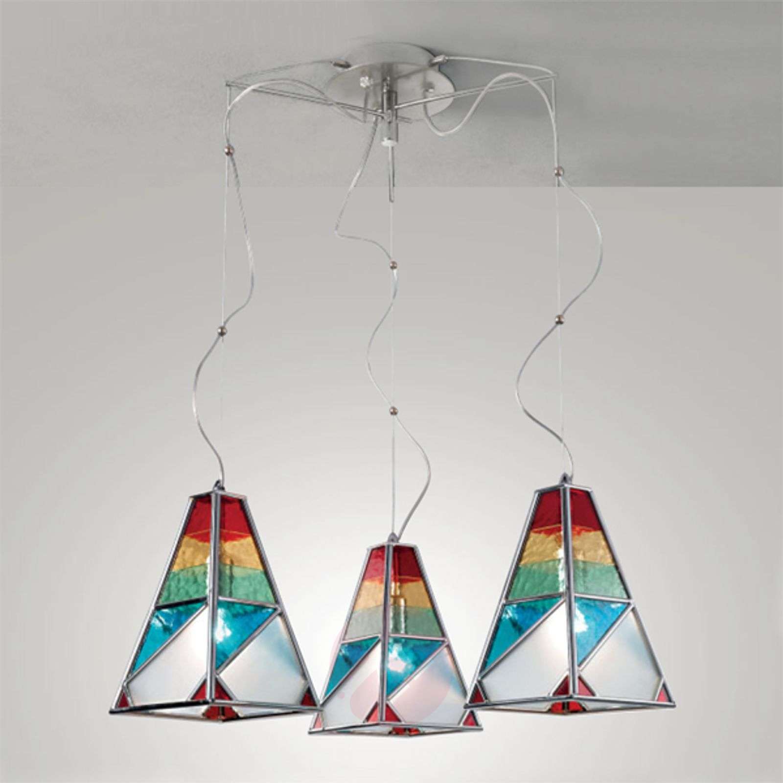 Dekoracyjna lampa wisząca TIF z kolorowymi, szklanymi kloszami Lampa wisząca TIF przywodzi na myśl swoimi szklanymi kloszami styl Tiffany, zinterpretowany w tym przypadku nowocześnie. Kolorowe i białe szklane elementy przeplatają się i są ujęte w metalowej konstrukcji z błyszczącą, chromowaną powierzchnią. Dekoracyjna lampa wisząca TIF zapewni doskonałe oświetlenie stołów w jadalniach lub grup mebli i uatrakcyjni wyposażenie oświetlanego wnętrza. Klasa efektywności energetycznej: A++