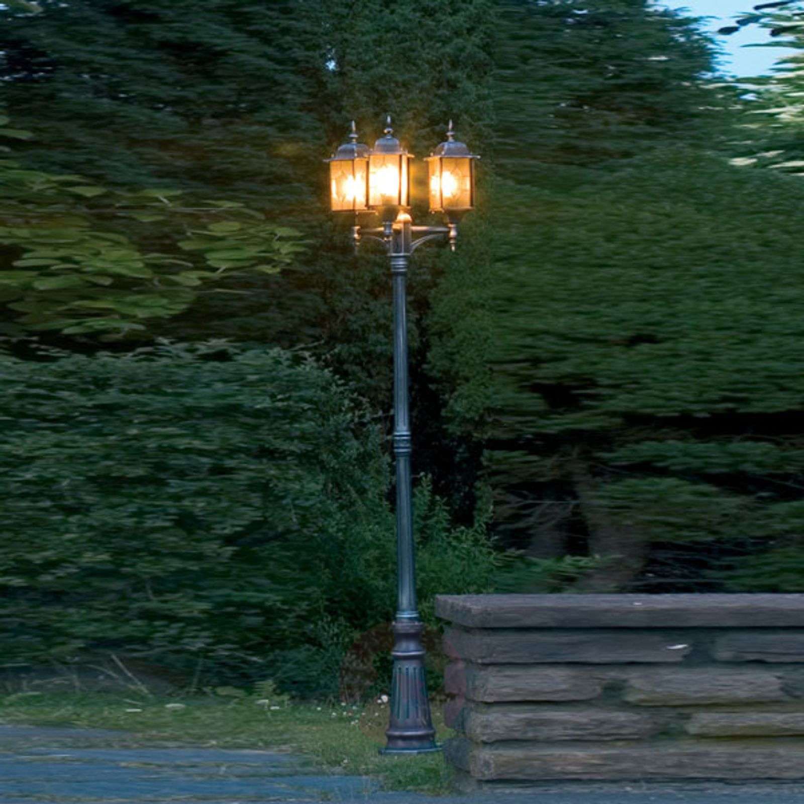 3-punktowa stylowa latarnia MILANO z aluminium Latarnia MILANO z aluminium z 3 oprawami w kształcie latarni stojącymi prosto prezentuje się bardzo szlachetnie dzięki wykonaniu ze szkła akrylowego ołowiowego kryształowego i zdobieniom na słupie i oprawach. Te 3 latarnie są rozmieszczone na bazie trójkąta i dzięki przezroczystym szklanym szybom gwarantują dobre oświetlenie. Klasa efektywności energetycznej: A++
