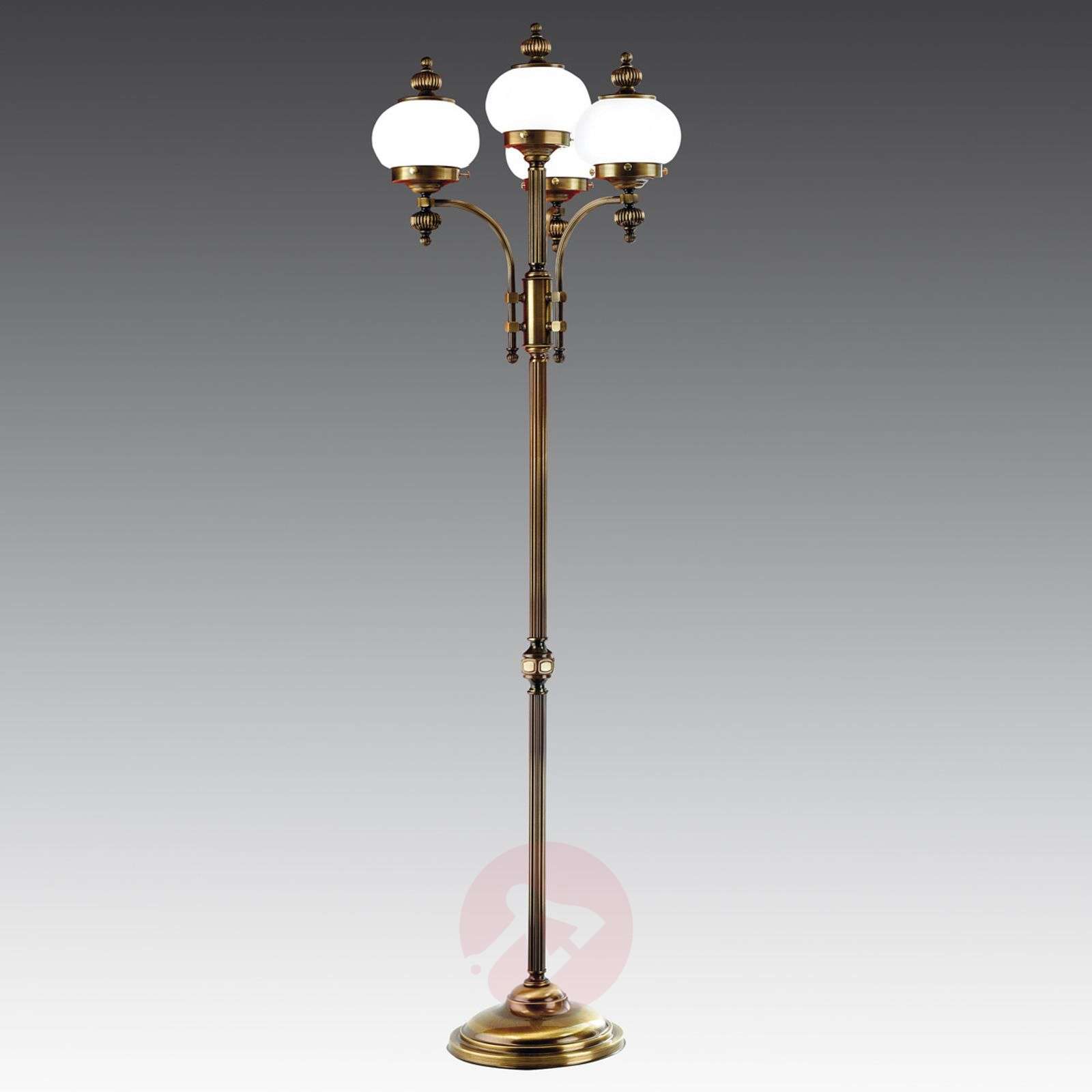 Lampa stojąca DELIA zapewni jednocześnie jasne i nastrojowe oświetlenie Lampa ta sprawia bardzo szlachetne wrażenie dzięki połączeniu metalowej konstrukcji z mosiądzu polerowanego na wysoki połysk i pękatych kloszy z matowego, mlecznego szkła. Elementem wyróżniającym tę lampę stojącą jest jej unikalna, wielopunktowa forma, przypominająca antyczną uliczną latarnię lub kandelabr, wprowadzająca do pomieszczeń wyjątkowe akcenty. Lampy te spełniają najwyższe wymagania w zakresie wysokiej jakości, elegancji i trwałości. Tutaj połączenie kreatywności projektantów i austriackiej sztuki rzemieślniczej pozwala na stworzenie produktów, znajdujących uznanie na arenie międzynarodowej. Od roku 1948 lampy tego producenta są wytwarzane w 100 % w Austrii, co gwarantuje dostępność części zamiennych przez długie lata. Na zapytanie dostępna także w innych rozmiarach i wykończeniach powierzchni. Klasa efektywności energetycznej: A++