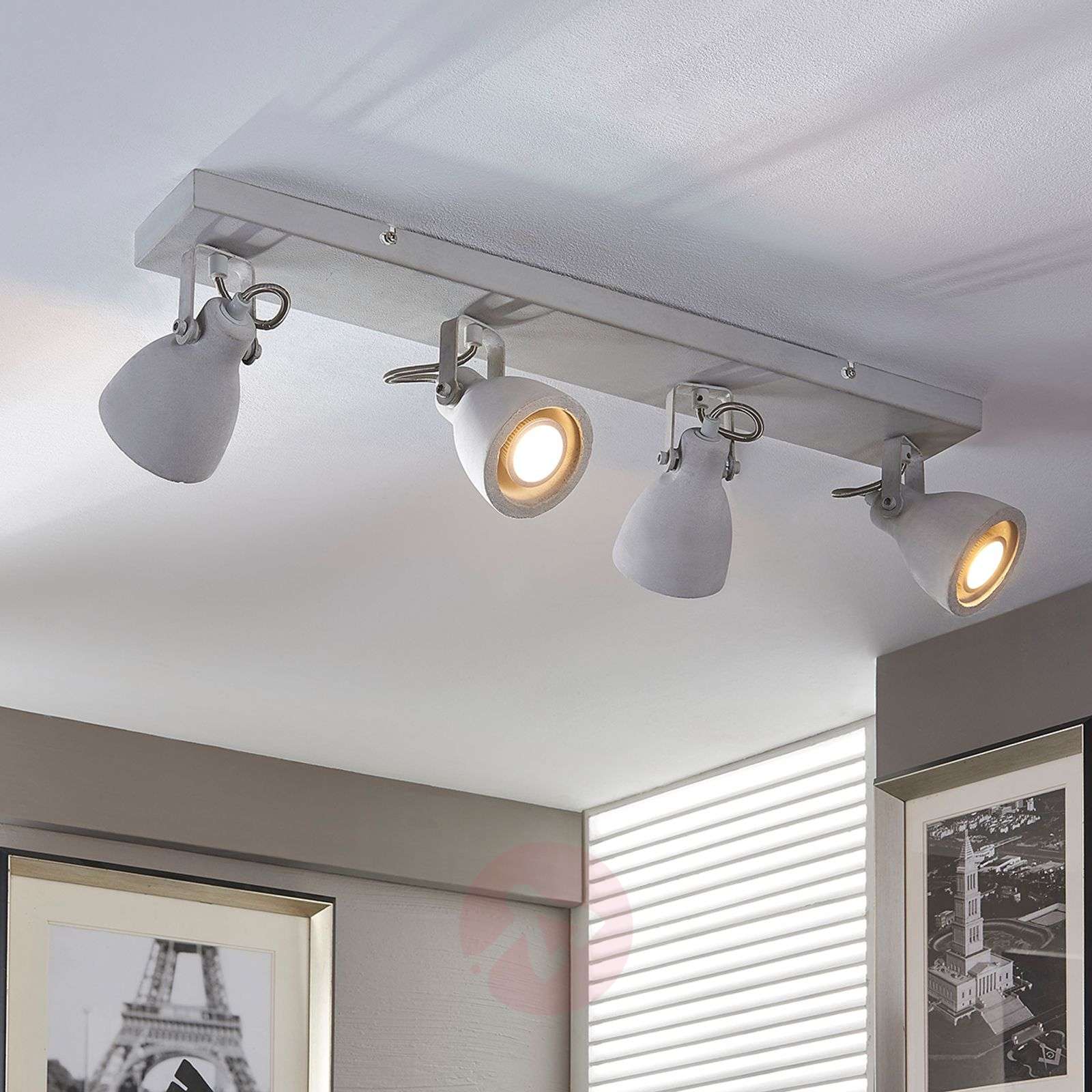 Regulowana LED-lampa sufitowa KADIGA z betonu, 4-punktowa KADIGA sprawdzi się doskonale w kuchni, gdyż jej głowice zapewniają dobre oświetlenie. Jej szczególną cechą jest to, iż klosze nie są wykonane ze szkła, metalu czy też tkaniny, lecz z betonu, z którego również wykonana jest belka. Dzięki niemu lampa od razu budzi skojarzenia ze stylem industrialnym, gdyż beton jest materiałem stosowanym przede wszystkim na budowie, lecz rzadko w produkcji elementów wystroju wnętrz. Ale to, co jest rzadkością niekoniecznie musi być złe, czego dowodem jest właśnie lampa KADIGA. Mimo chłodnej barwy prezentuje się doskonale i stanowi stylowy dodatek do nowoczesnych lub industrialnych wnętrz. Klasa efektywności energetycznej: A+