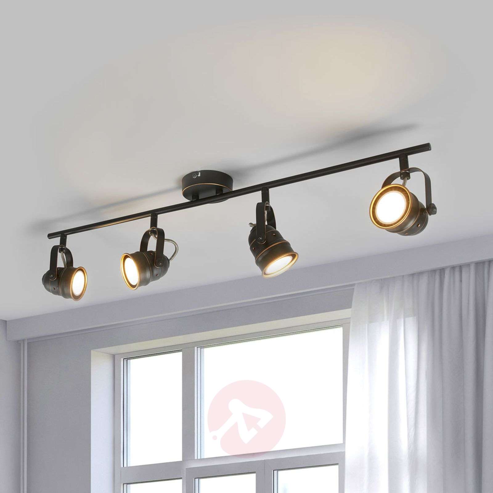Czarno-złota lampa sufitowa LED Leonor z regulowanymi kloszami metalowymi Lampa sufitowa LED Leonor to doskonałe oświetlenie do pomieszczeń, w których dobrze prezentuje się styl vintage. Powierzchnia lampy stylizowana na starodawną harmonijnie łączy dwa kolory: czarny i złoty. Każdy klosz można przestawiać i tym samym szybko ustawić kierunek światła. Lampa sufitowa LED sprawdzi się szczególnie jako oświetlenie kuchni i innych pomieszczeń, w których niezbędne jest jasne światło. Klasa efektywności energetycznej: A+