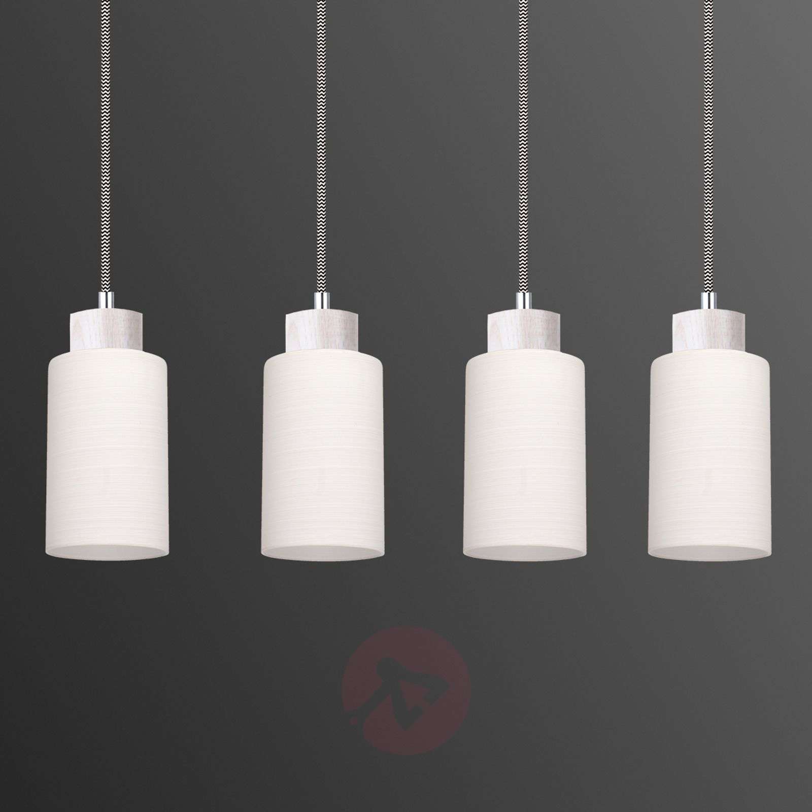 Nowoczesna 4-punktowa lampa wisząca Bosco w formie belki 4-punktowa lampa wisząca Bosco to drewniana belka, z której na długość 74 centymetrów zwisają cztery oprawy z białymi szklanymi kloszami, umieszczone jedna obok drugiej na kablach w czarno-białych materiałowych osłonach. Padające w dół światło zapewnia równomierne oświetlenie np. nad długim stołem w jadalni lub kuchennym barkiem. Jest ona nowoczesnym źródłem światła, które dzięki ponadczasowej urodzie będzie cieszyć użytkownika przez wiele, wiele lat. Klasa efektywności energetycznej: A++