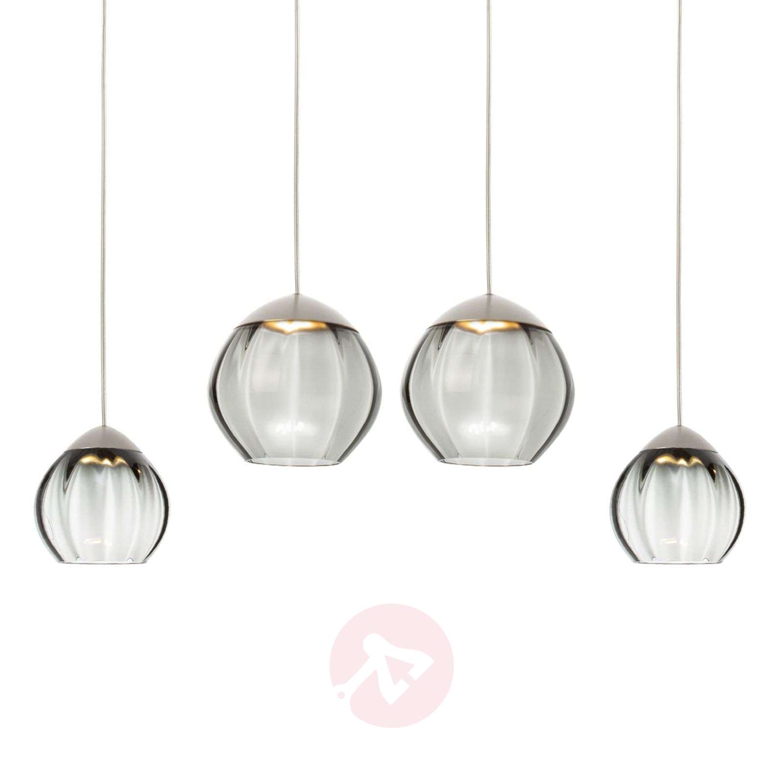 Lampa wisząca LED Soft z czarnymi przezroczystymi kloszami, 4-punktowa Ta 4-punktowa lampa wisząca LED Soft z nieregularnie rozmieszczonymi pojedynczymi lampkami wygląda wprost niezwykle nad stołem w jadalni czy też nad blatem kuchennym. Dwie wewnętrzne lampy wiszące zawieszone są nieco wyżej, dzięki czemu światło emitowane przez każdą z tych czterech lamp może swobodnie przedostawać się do pomieszczenia. Kształt kloszy wykonanych z tłoczonego szkła sprawia, że światło emitowane przez lampę daje wprost fascynujące refleksy. Nowoczesne zawieszenie z prostoliniowa rozetą sufitową, wykonane z metalu opatrzonego matowym niklowaniem, stanowi harmonijne wizualne dopełnienie całości. Ciepłobiałe światło LED, emitowane przez tę lampę, zyskuje delikatny blask dzięki ciemnemu odcieniowi szklanych kloszy. Klasa efektywności energetycznej: A+