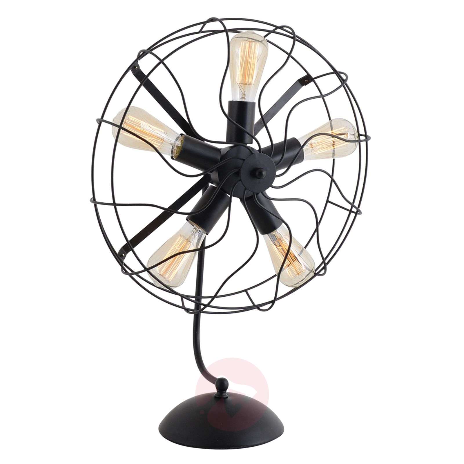 Niezwykła lampa stołowa Ruby Gdyby nie żarówki, można by pomyśleć, że lampa stołowa Ruby tak naprawdę jest wentylatorem. Klosz lampy stołowej ma kształt klatki wykonanej z czarnej metalowej kratki i wygląda jak koszyk ochronny wentylatora. W każdej z pięciu opraw, które wychodzą ze środka i razem tworzą kształt gwiazdy, jest umieszczona żarówka E27. Bardzo ładnie wygląda tu w szczególności tradycyjna żarówka lub żarówka LED w kształcie kolby, jak pokazano na zdjęciu. Lampę stołową obsługuje się za pomocą przełącznika umieszczonego na kablu. Klasa efektywności energetycznej: A++