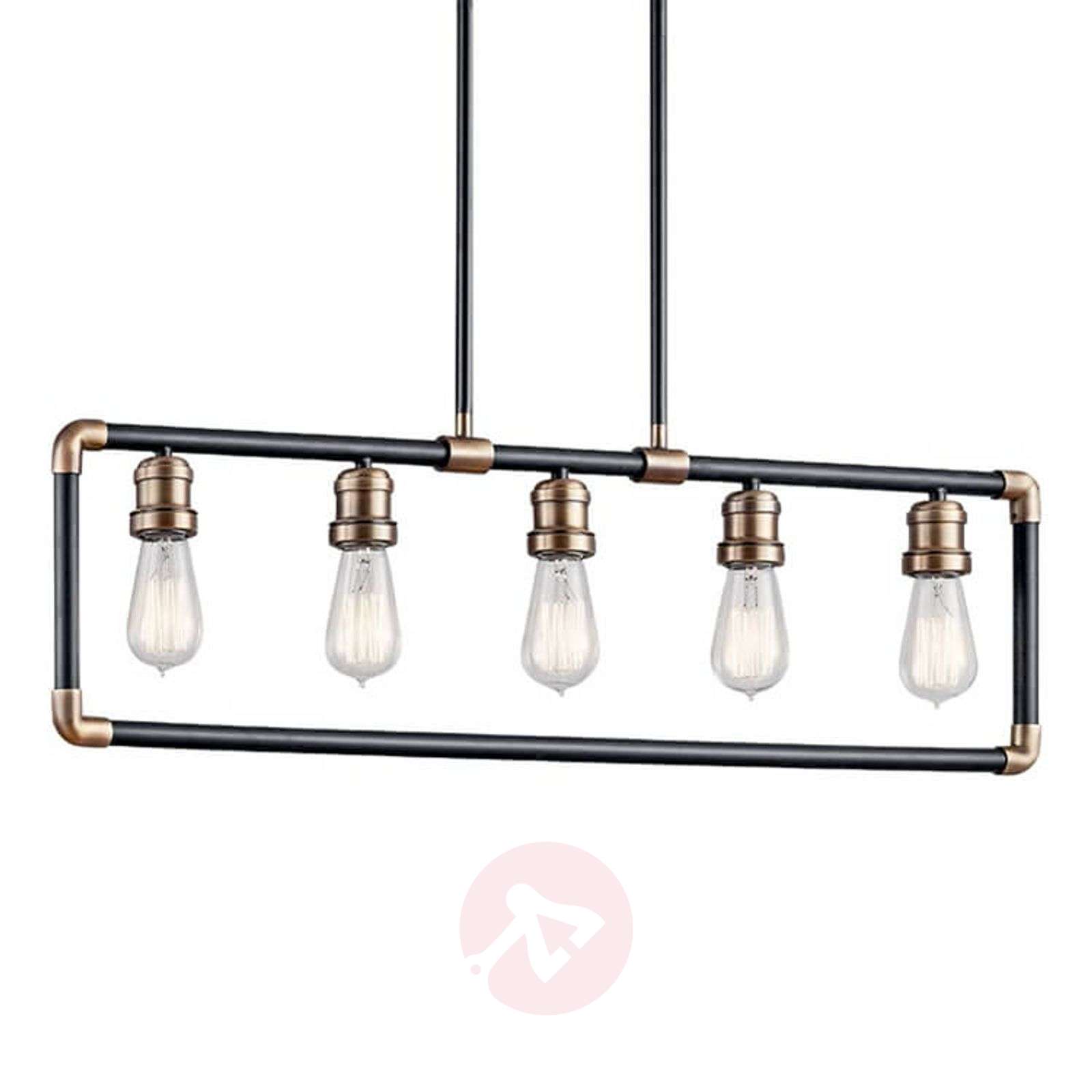 5-punktowa lampa wisząca Imahn z metalu, o modnym wyglądzie Miłośnicy modnego stylu vintage lub też stylu industrialnego po prostu pokochają tę lampę wiszącą, ponieważ jej solidny design i detale wykonane z mosiądzu ucieleśniają ten styl w najdrobniejszych szczegółach. Ta lampa zyskuje jeszcze bardziej oryginalny wygląd przede wszystkim gdy użyjemy tak zwanych żarówek vintage. Dzięki pięciu żarówkom E27 i wydłużonemu kształtowi Imahn idealnie nadaje się do oświetlania dużego stołu jadalnego. Klasa efektywności energetycznej: A++