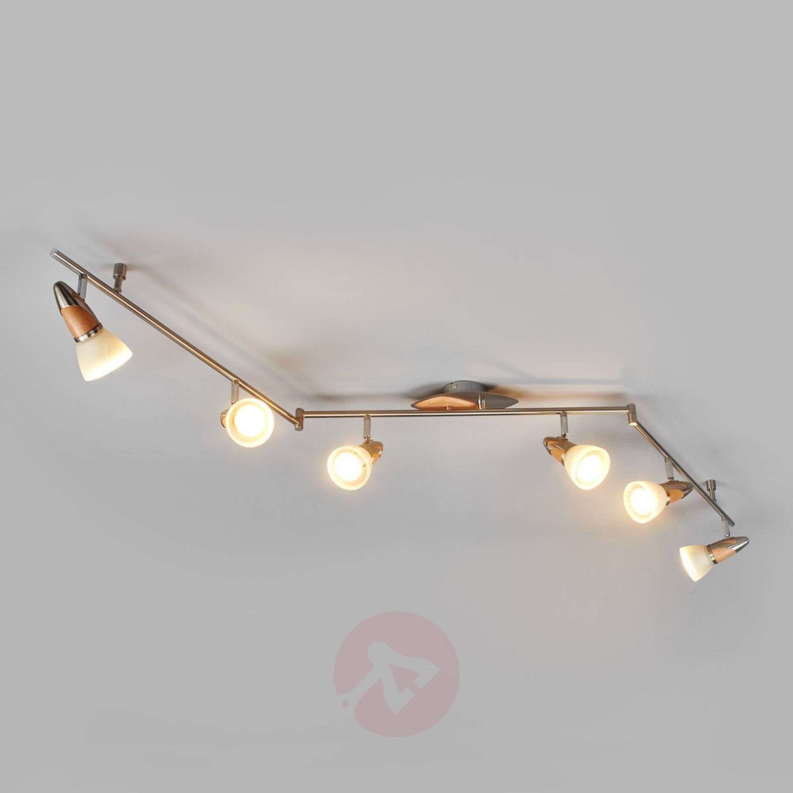 Idealne oświetlenie do przestronnych wnętrz – 6-punktowa lampa sufitowa LED MARENA z drewnianymi elementami MARENA posiada łączną długość równą 1,80 m, co czyni z niej sporej wielkości lampę zdolną do odpowiedniego oświetlenia większych pomieszczeń. Żarówki reflektorowe LED, w które została wyposażona MARENA, pozwalają zaoszczędzić energię i obniżyć koszty prądu. Zimny design, jaki nadaje lampie metalowa oprawa, ocieplają drewniane elementy, które razem idealnie się uzupełniają. Klasa efektywności energetycznej: A+