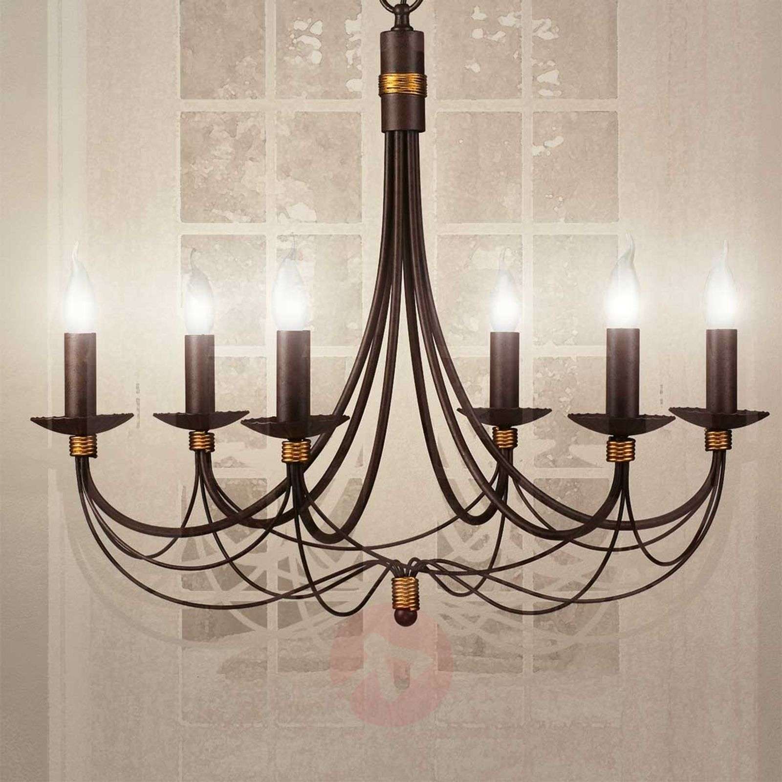 Leonardo - żyrandol, który zapewni stylowe oświetlenie Żyrandol Leonardo to typowy reprezentant klasy samej w sobie. Sześć świec spoczywa tutaj na sześciu wygiętych ku górze ramionach z ciemnobrązowego metalu. Tam, gdzie niegdyś paliły się świece, dziś znajdują się świecowe żarówki elektryczne. Pomimo to żyrandolowi udało się zachować klasyczny urok. Made in Italy. Klasa efektywności energetycznej: A++