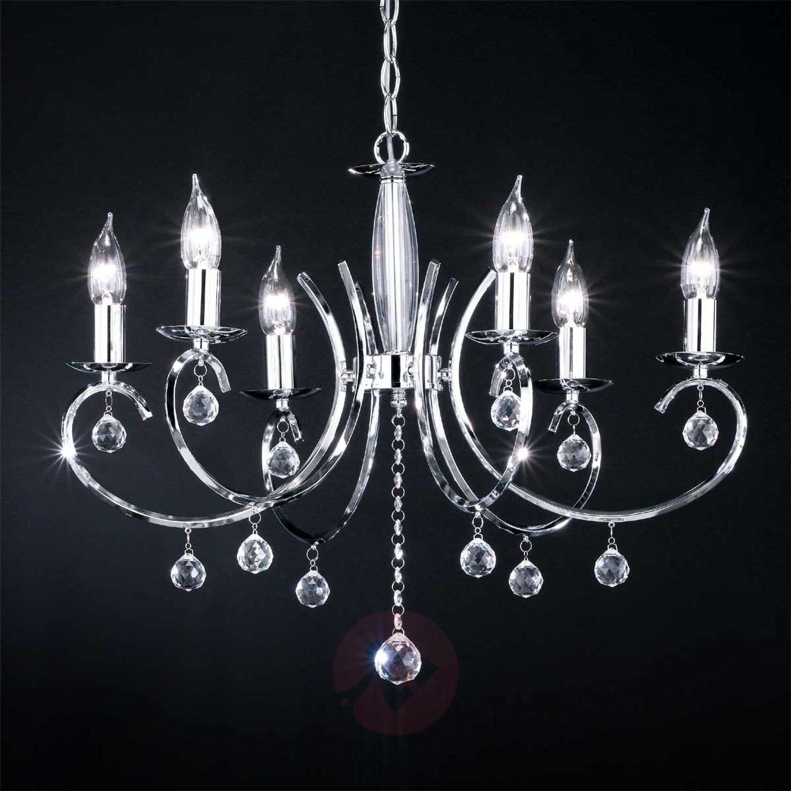 Szlachetnie połyskujący, modny żyrandol SALA w kolorze chromu Pięknie gięty metalowy stelaż i świece z okapnikami żyrandola SALA mają kolor błyszczącego chromu. Przezroczyste zawieszki ze szkła zdobią żyrandol i przyczyniają się do powstania wspaniałych efektów świetlnych. SALA jest żyrandolem, który wniesie do każdego pomieszczenia odrobinę nastrojowego blasku, a nad jadalnianym stołem zapewni czarujące oświetlenie. Klasa efektywności energetycznej: A++