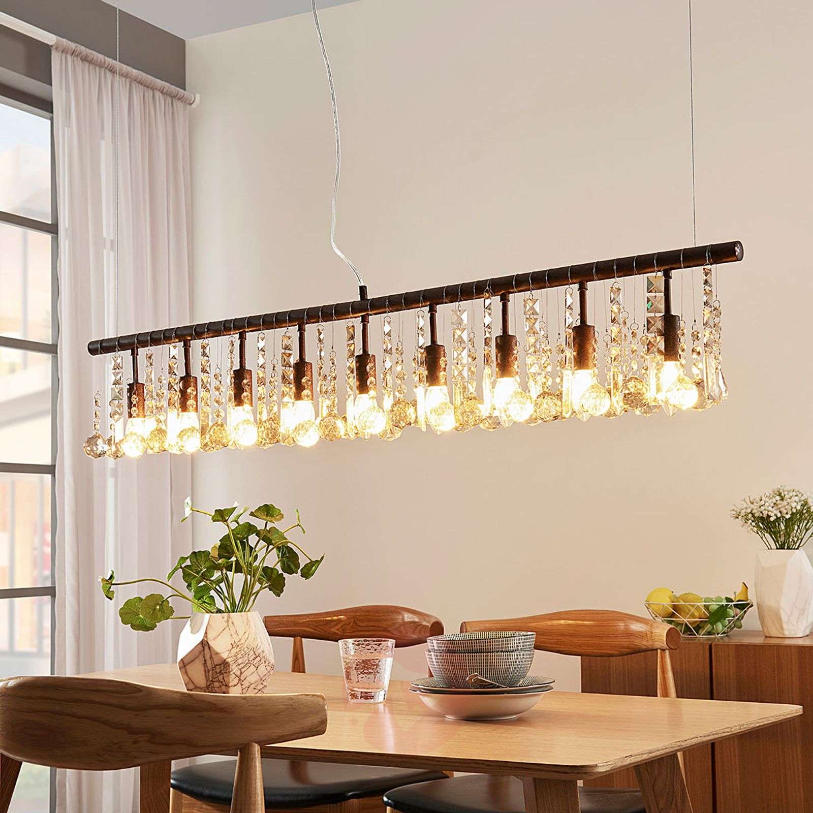 Rdzawobrązowa lampa wisząca Matei z bursztynowymi ozdobami Mate szczególnie atrakcyjnie wygląda w jadalni dzięki wydłużonemu kształtowi i połączeniu rdzawego metalu z przezroczystymi wisiorkami w kolorze bursztynu. Taki zestaw kolorystyczny daje wrażenie ciepła. Krawędzie oszlifowanych wisiorków tworzą piękne refleksy świetlne, które dzięki bursztynowej powierzchni również wyglądają na bardzo ciepłe. Dzięki wydłużonemu kształtowi i 9-punktowej konstrukcji lampa wisząca belka Matei jest wspaniałą lampą do jadalni. Klasa efektywności energetycznej: A++
