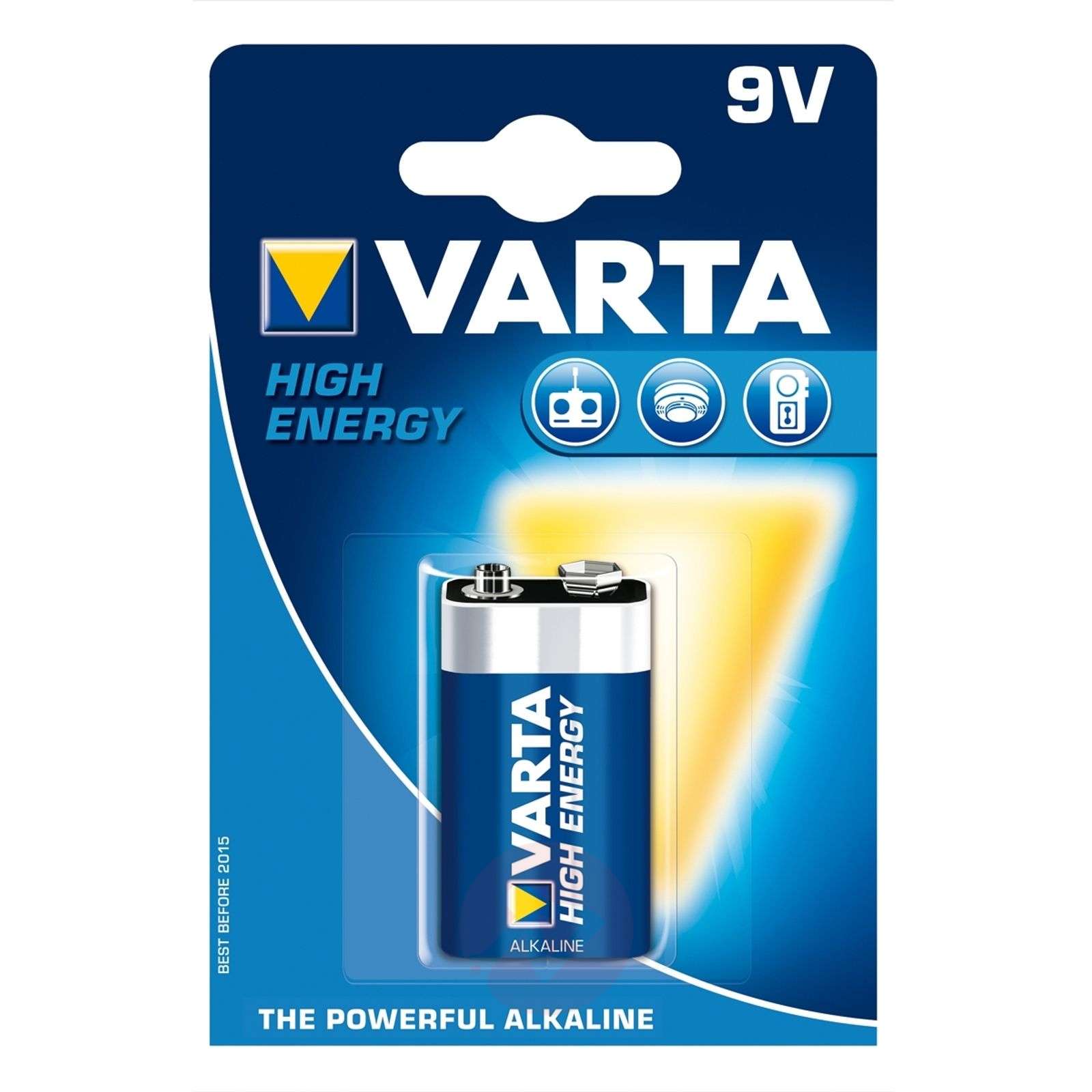 9V E-Block VARTA High Energy High Energy - najczęściej zamawiane baterie VARTA. Praktyczne i mocne (do urządzeń elektrycznych, czujników dymu itp.). - Alkaline - wymiary: długość 4,85 cm, szerokość 1,75 cm, wysokość 2,65 cm