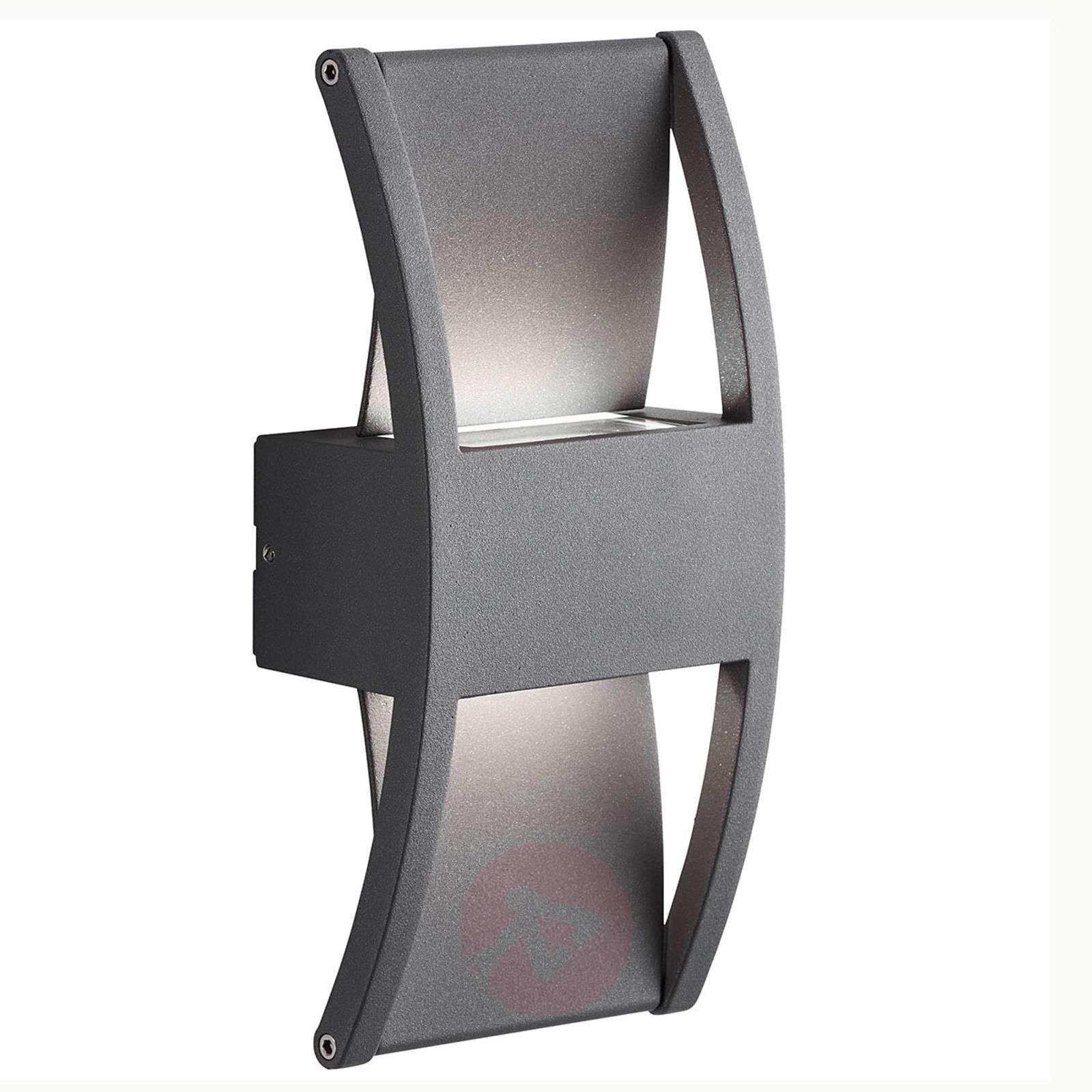 Lampa zewnętrzna ścienna LED Elroy ze sterowanymi refleksami Wyjątkowo ukształtowana lampa zewnętrzna ścienna LED Elroy wykonana jest z aluminium. AEG nadaje lampie właściwości samoczyszczące dzięki nanotechnologicznej obróbce. W centrum wypukłego kształtu znajduje się korpus, na górze i na dole którego źródła światła LED umieszczono za szklanymi szybami. Klapy są montowane pomiędzy końcami przedłużeń ramion, których kąt można regulować za pomocą śrub imbusowych. W ten sposób światło może odbijać się w górę i w dół do przodu lub do tyłu ściany. Klasa efektywności energetycznej: A