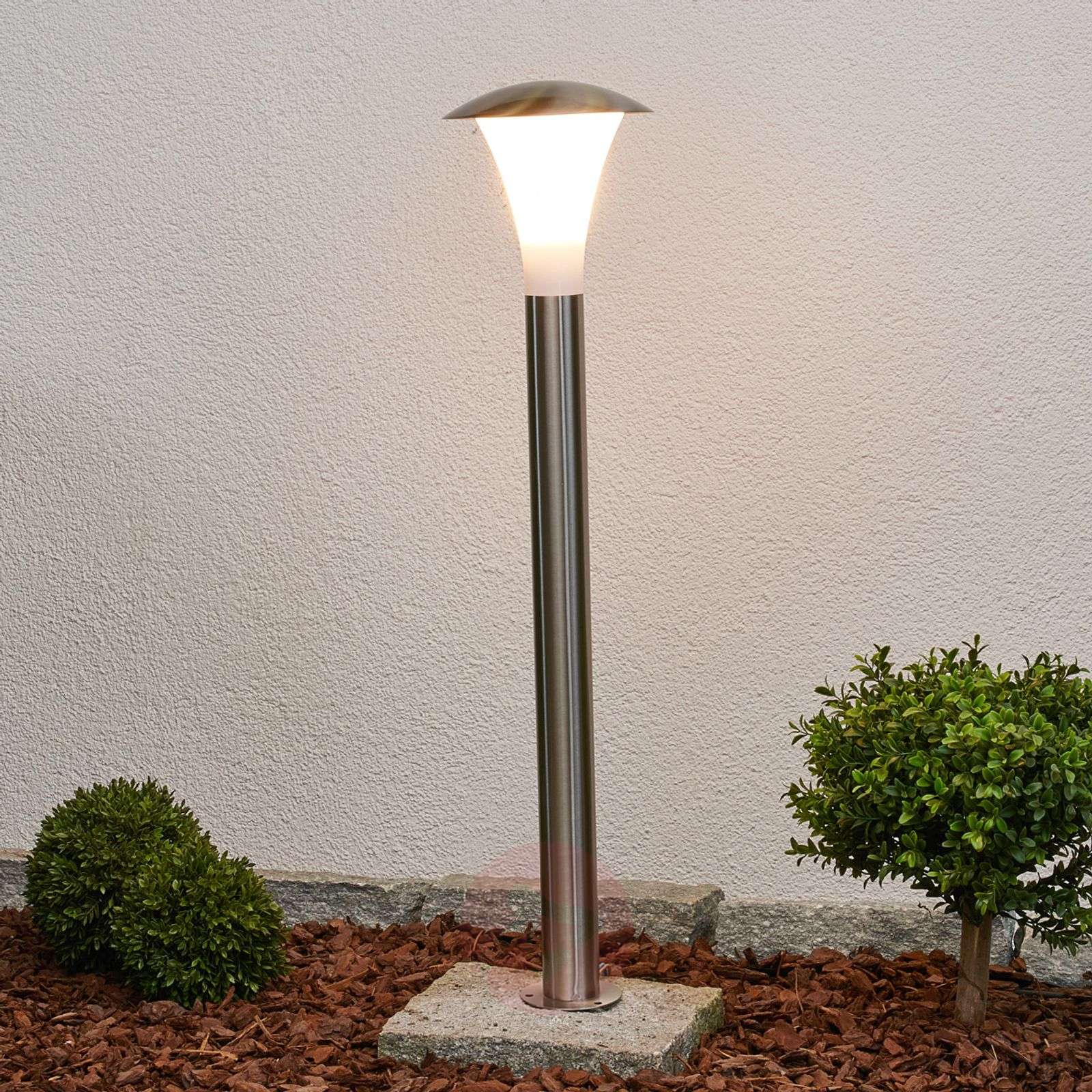 Oświetlenie ścieżek ARDA z oprawą ze stali szlachetnej Oświetlenie ścieżek ARDA charakteryzuje piękny, ponadczasowy design będący połączeniem stali szlachetnej i białego poliwęglanu. Biały, opalowy klosz jest rozszerzany ku górze i zakończony swego rodzaju nasadką wykonaną tak jak oprawa ze stali szlachetnej. Wykonany z tworzywa sztucznego dyfuzor odznacza się wysoką wytrzymałością oraz odpornością na uderzenia. Biała, opalowa powierzchnia zapewnia równomiernie rozproszone światło w postaci łagodnej poświaty bez efektu olśnienia. Oprawka E27 umożliwia stosowanie różnych żarówek – od tradycyjnych i halogenowych po wydajne żarówki LED i żarówki energooszczędne, które są nie tylko przyjazne środowisku, ale również portfelowi. Klasa efektywności energetycznej: A++