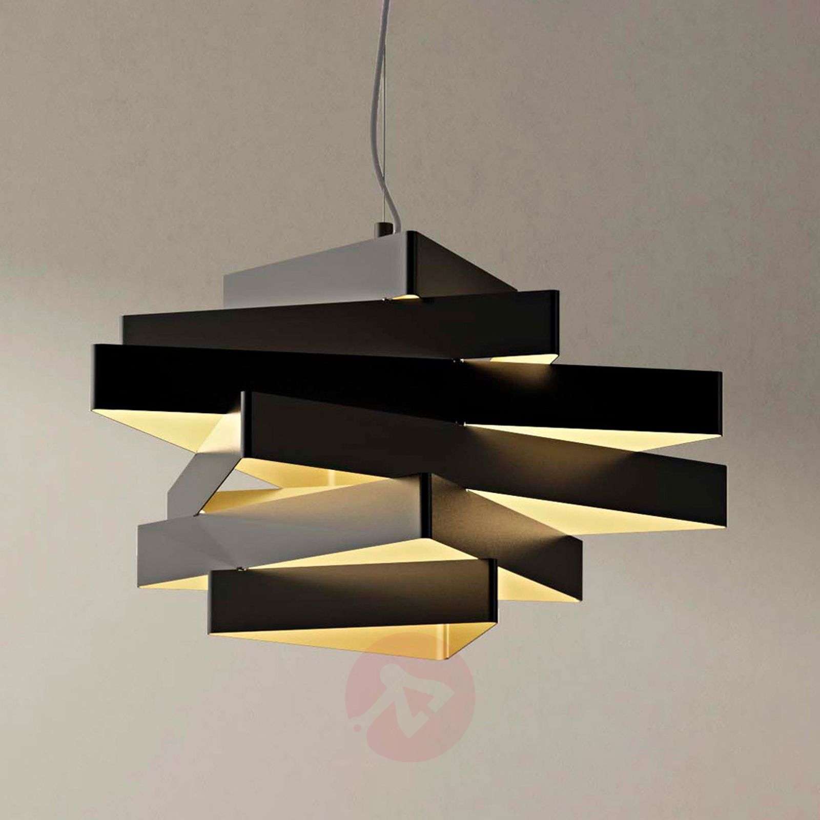 Metalowa lampa wisząca Miles w eleganckich odcieniach czerni i złota Lampa wisząca Miles to przepiękna mieszanka jasnych i ciemnych odcieni kolorystycznych. Dekoracyjne, trójkątne elementy podkreślają dodatkowo nowoczesny styl, który widać również w innych aspektach. Trójkąty są pokryte ciemnym, czarnym lakierem, którego uzupełnienie stanowi złota kolorystyka wnętrza. Charakterystyczną cechą wyglądu lampy jest rozmieszczenie poszczególnych elementów. Nie są one ułożone równo jeden pod drugim, tylko każdy odwrócony w inną stronę. Przy odrobinie fantazji można dojrzeć kształt rombu. W dużej konstrukcji klosza ukryte są oprawy E27. Lampa wisząca Miles zdecydowanie zwraca uwagę interesującą formą i doskonale pasuje do nowoczesnych mieszkań z czarnymi i/lub złotymi akcentami. Klasa efektywności energetycznej: A++