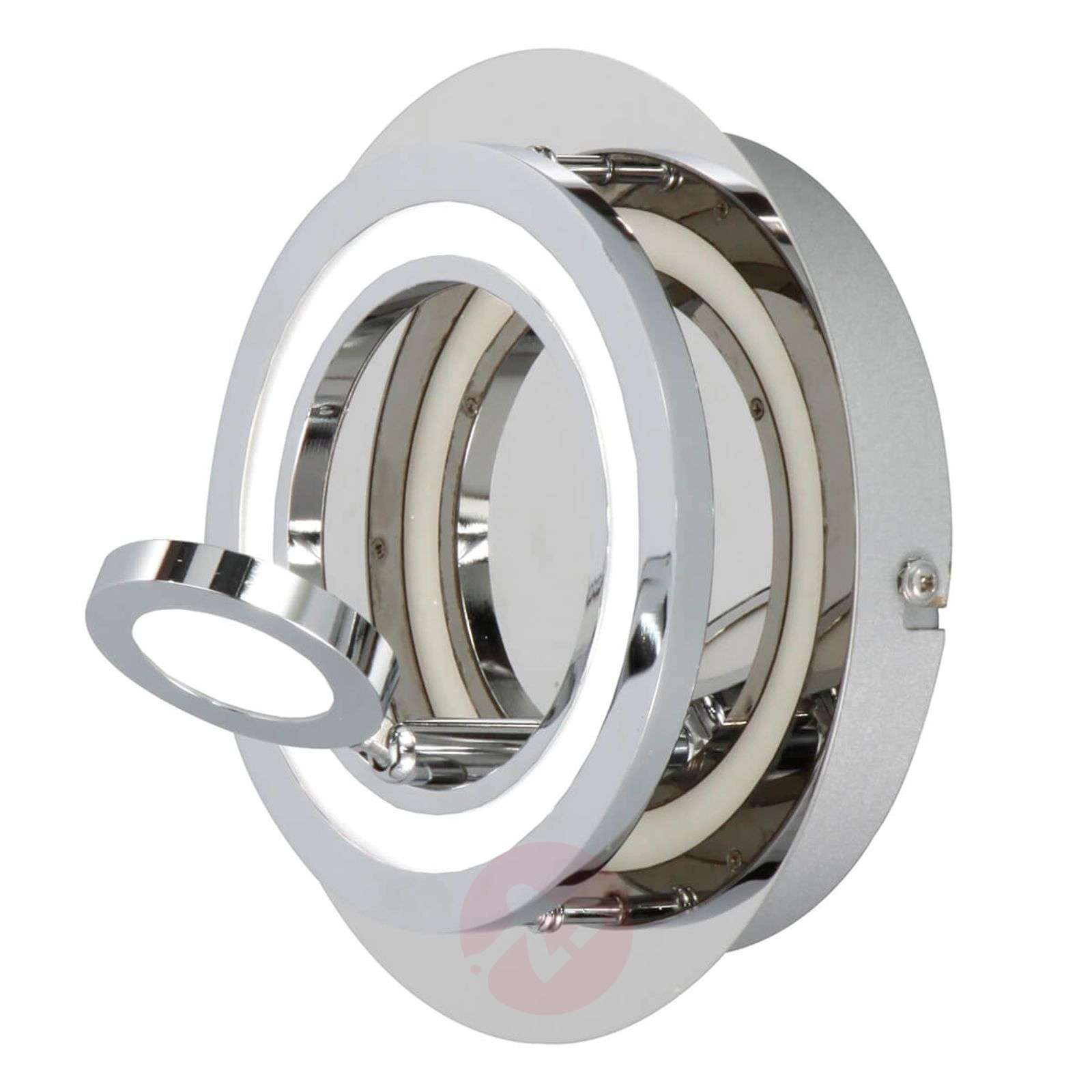 Lśniący kinkiet LED Aiden w unikalnym stylu Kinkiet LED Aiden składa się z okrągłego elementu ściennego z przełącznikiem, zamontowanego na nim pierścieniowego elementu świetlnego oraz małego, umieszczonego w nim spotu. Lśniący chromowany metal z efektem lustrzanym sprawia, że kinkiet ten prezentuje się bardzo elegancko i nowocześnie. Spot można ustawiać pod różnymi do pierścienia kątami, nieznacznie zmieniając w ten sposób wygląd lampy ściennej i uzyskując oświetlenie kierunkowe. Sam pierścień emituje światło rozproszone. Klasa efektywności energetycznej: A+