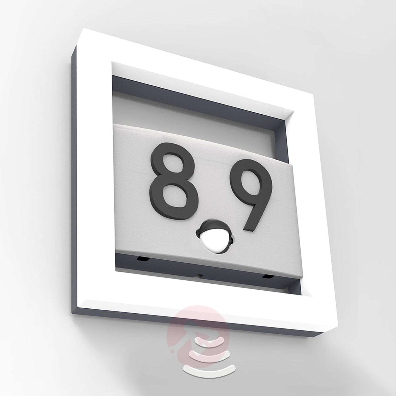 Alice – lampka LED z numerem domu, ze zintegrowanym czujnikiem Lampa ścienna, „drogowskaz” i ozdoba elewacji – lampka LED z numerem domu Alice łączy w sobie to wszystko. Dzięki nowoczesnej technologii LED zapewnia energooszczędne oświetlenie, emitowane pod kątem wiązki 57°. Do srebrnej plastikowej płytki można przykleić numer domu. Do lampy dołączono czarne litery od A do Z oraz cyfry od 0 do 9. Zintegrowany czujnik ruchu jest regulowany (ściemnianie i czas trwania oświetlenia) i wykrywa ruch pod kątem 120° oraz w odległości od 4 do 7 metrów – w przypadku montażu na wysokości od 1,80 do 2,00 metra. Klasa efektywności energetycznej: A+