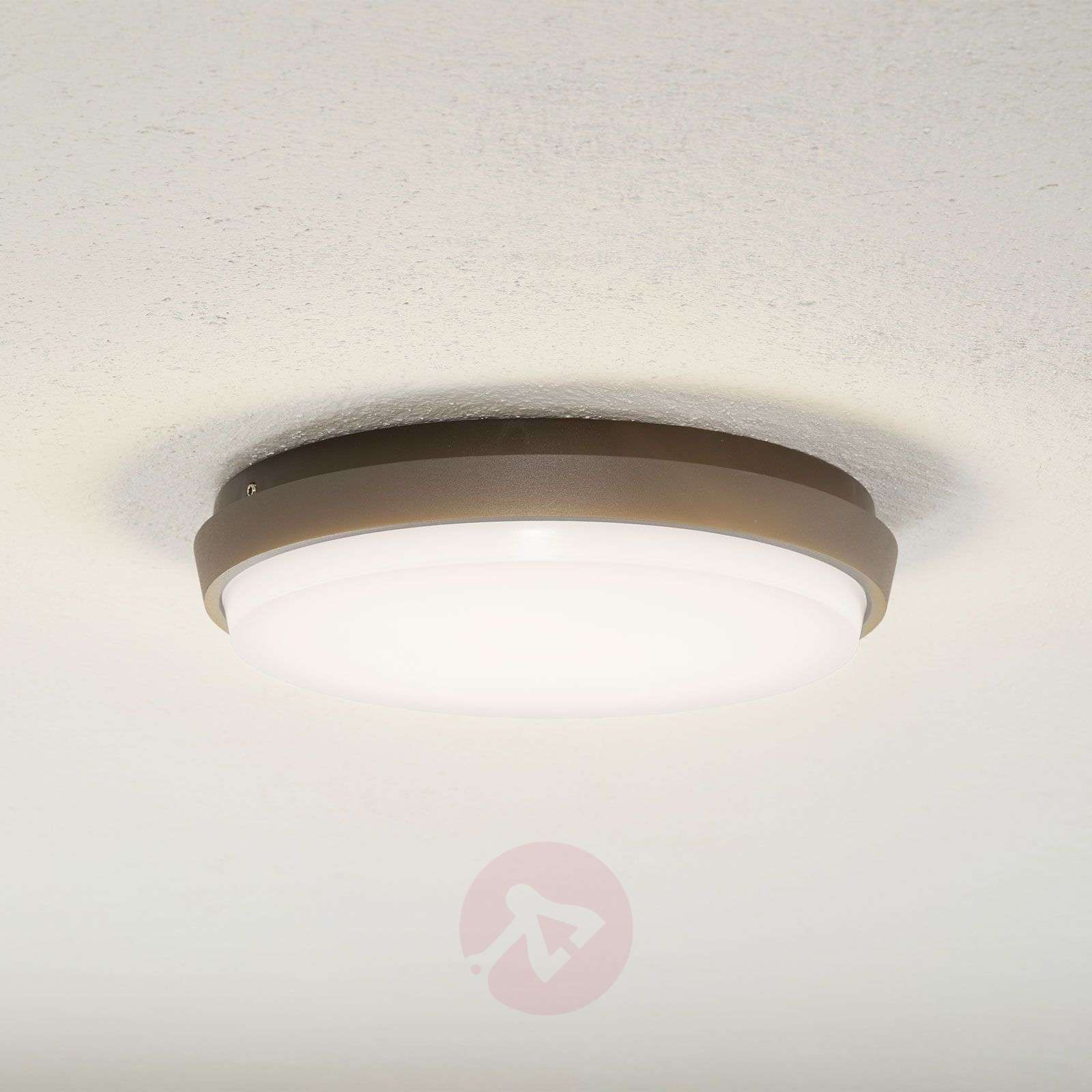 Prosta lampa sufitowa zewnętrzna LED Amra o dużej mocy światła Oprawę Amra można zamontować na ścianie zewnętrznej lub zastosować jako lampa sufitowa zewnętrzna, aby oświetlić na przykład zadaszone wejście, balkon lub taras. Ramka z ciśnieniowego odlewu aluminium ma kolor ciemnoszary. Za białym kloszem z poliwęglanu znajdują się energooszczędne diody LED o dużej mocy, które umożliwiają jasne, miękkie oświetlenie otoczenia. Klasa efektywności energetycznej: A+