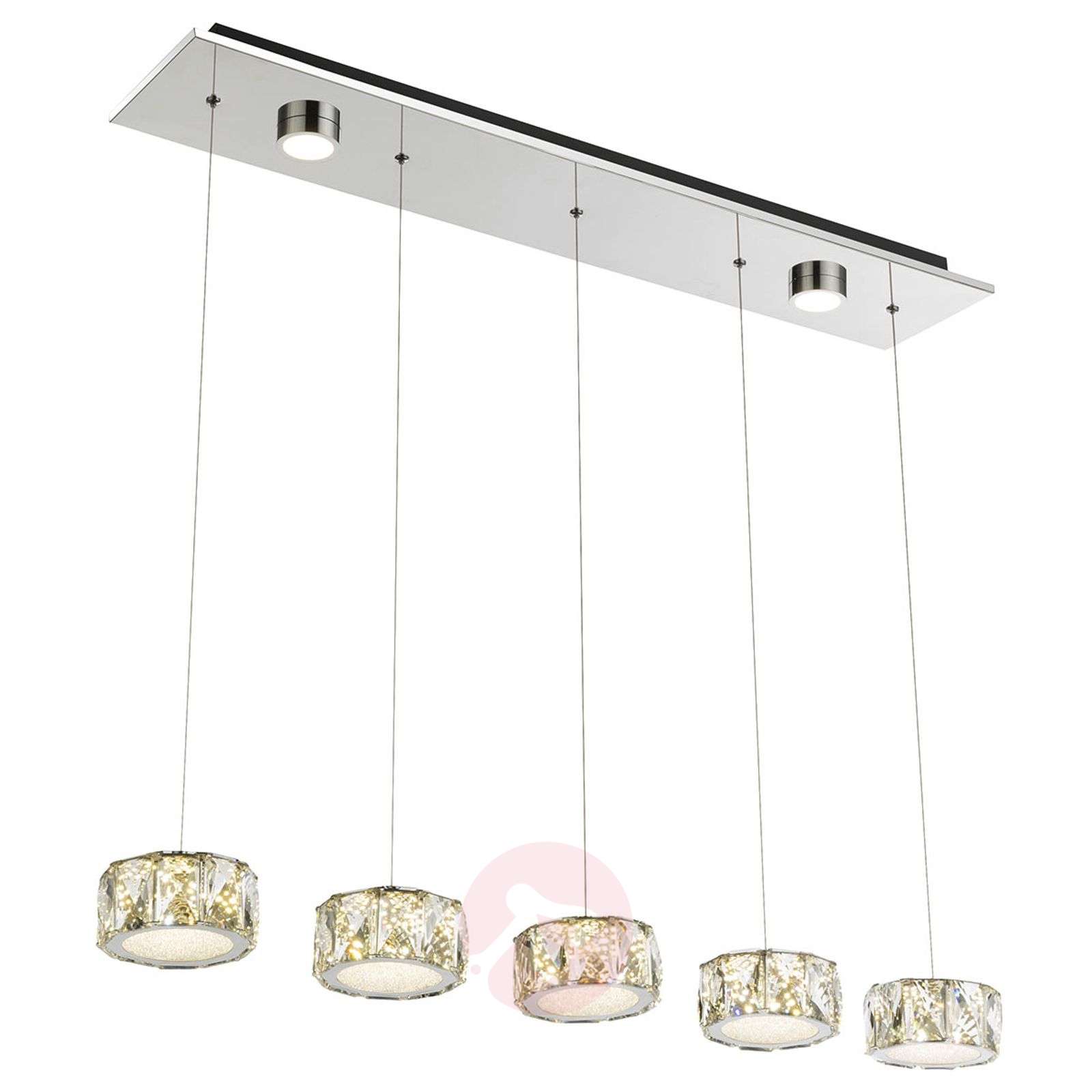5-punktowa lampa wisząca LED Amur z dodatkowymi spotami – imponujące i dekoracyjne rozwiązanie oświetleniowe Dzięki pięciu okrągłym kloszom ze szkła i akrylu, lampa wisząca LED Amur gwarantuje w pomieszczeniu intensywne, a jednocześnie nieoślepiające oświetlenie. Skuteczność świetlną zwiększają dwie dodatkowe spoty LED zintegrowane w chromowanym elemencie sufitowym. Dzięki niezwykłemu kształtowi kloszy i umiejętnie rozmieszczonym spotom powstają ekscytujące efekty świetlne. Model opiera się na urozmaiconej optyce z wieloma oryginalnymi detalami i dyskretnym kontraście pomiędzy zabawnymi zaokrągleniami kloszy a wyrazistością prostokątnej płyty sufitowej. 5-punktowa lampa wisząca LED Amur to stylowy dodatek do rozmaitych ponadczasowych i luksusowych koncepcji pomieszczeń. Lampa ta wygląda stylowo i harmonijnie zarówno w przestronnym salonie, jak i jako oświetlenie dużego stołu w jadalni lub na przykład źródło światła dla nowoczesnego biura. Klasa efektywności energetycznej: A+