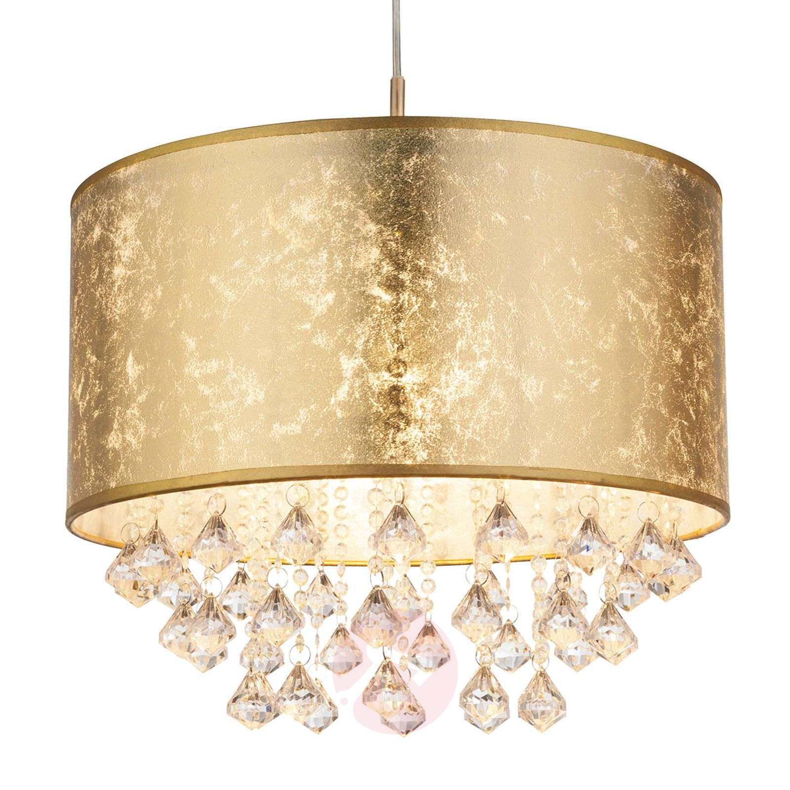 Lampa wisząca Amy z kloszem z tkaniny w złotym kolorze i szklanymi kryształami – dla luksusowych rozwiązań oświetleniowych Okrągły klosz pokryty delikatną tkaniną i szlachetny złoty kolor nadają tej lampie wiszącej wyraźnie świątecznego wyglądu. Zawieszka z przezroczystych szklanych kryształów wzmacnia to wrażenie i tworzy zabawny kontrast z tekstylnym wyglądem klosza. Design lampy wiszącej Amy skutecznie łączy w sobie powściągliwą, klasyczną elegancję z efektownymi ozdobami. Lampa wisząca Amy idealnie pasuje do wszystkich stylów wyposażenia kładących nacisk na luksus i wysokie wymagania estetyczne. Amy można zastosować w salonie, na korytarzu czy też w eleganckiej, przytulnej sypialni - ten model wzbogaci każde pomieszczenie. Rozwiązanie oświetleniowe można dopełnić innymi ozdobnymi oprawami świetlnymi. Klasa efektywności energetycznej: A++