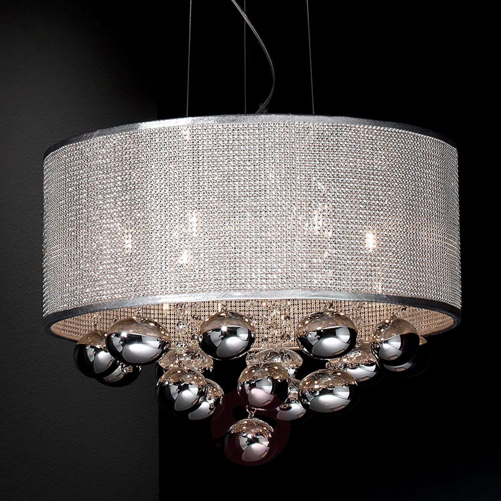 Andrómeda – lampa wisząca LED o bogatych ozdobach Klosz lampy wiszącej LED Andrómeda jest wykonany z winylu, który został osłonięty chromowaną, tłoczoną kratką. W kloszu na różnych wysokościach zwisają kryształowe łańcuszki oraz liczne chromowane bańki z kryształowego szkła. Odbicia na chromowanej powierzchni szklanych baniek oraz refleksje światła na elementach kryształowych powodują wyjątkową grę światła i sprawiają, że lampa wisząca LED Andrómeda nad stołem stanowi prawdziwą rozkosz dla oka. Za sprawą swojej charakterystycznej dekoracji klosz lampy wydaje się niemal latać nad stołem, zawieszenie jest bowiem bardzo filigranowe, a stalowe linki niemalże niewidoczne. Klasa efektywności energetycznej: A+