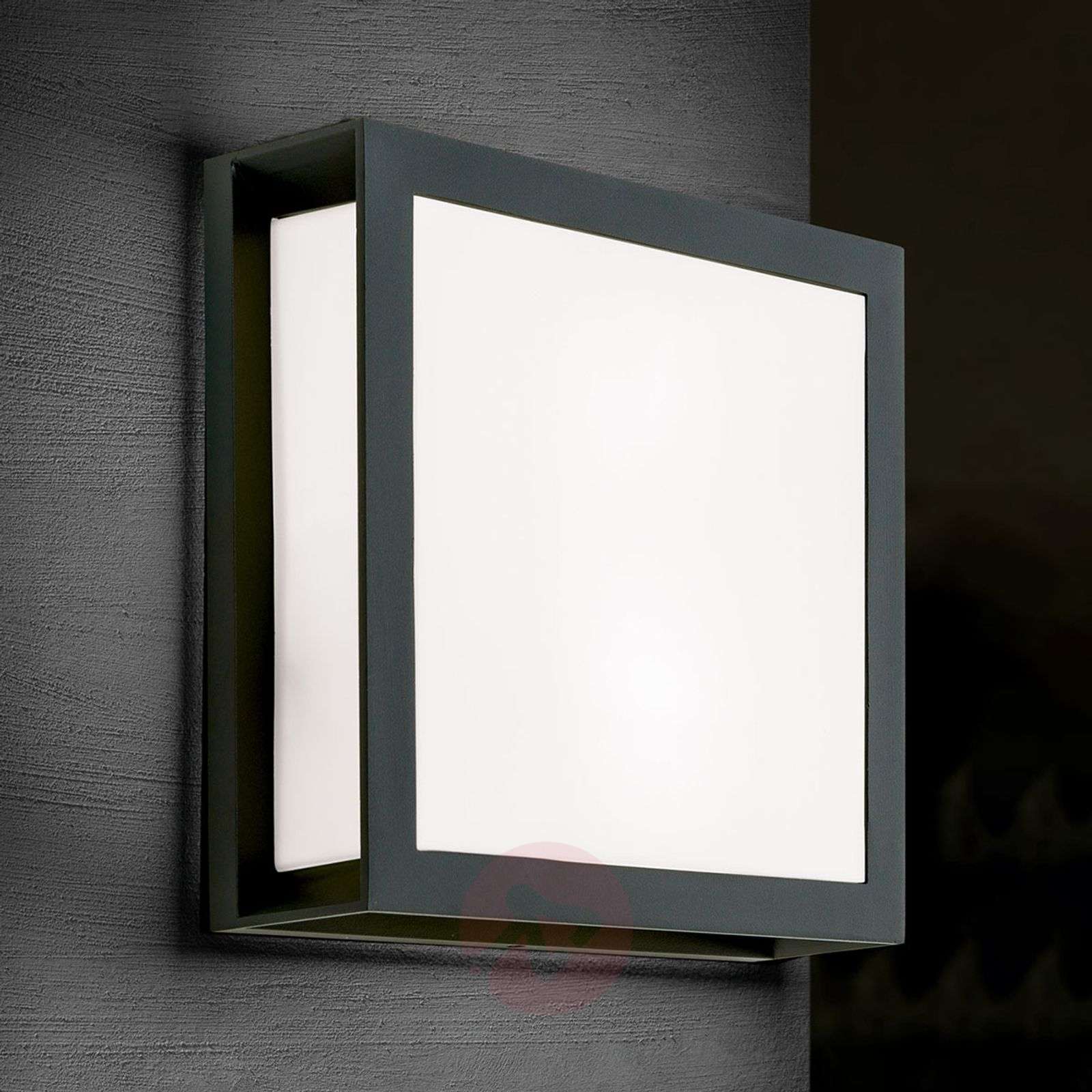 Kwadratowa lampa zewnętrzna ścienna Henry, IP44 Ta zewnętrzna lampa ścienna Henry, posiadając duży dyfuzor z opalowego szkła, sprawia, że światło rozchodzi się we wszystkich kierunkach. Rama w kolorze antracytowym, wykonana z aluminium, stylowo okala klosz lampy i przyczynia się do powstania udanych kontrastów kolorystycznych. Henry może być używana nie tylko jako lampa ścienna, ale również jako lampa sufitowa, stanowiąca ponadczasowe źródło światła, umieszczone na zewnątrz budynku. Ta lampa zewnętrzna wyposażona jest w dwie żarówki E27. Klasa efektywności energetycznej: A++