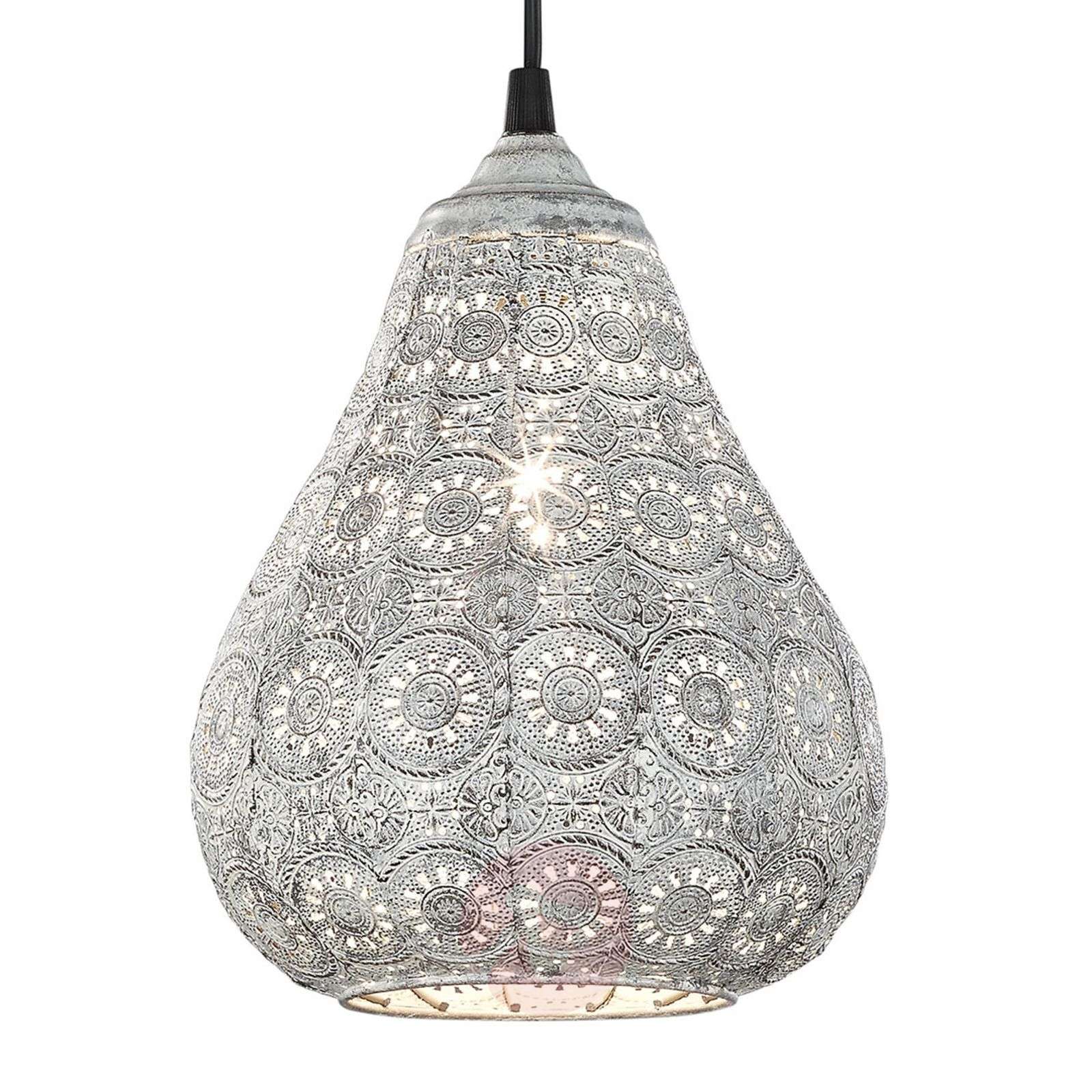 Lampa wisząca Jasmin o orientalnym designie w kolorze antycznym szarym Metalowy klosz lampy wiszącej Jasmin ma kształt gruszki i jest w całości ozdobiony orientalnym perforowanym wzorem. Umieszczona nad stołem w salonie lub jadalni, lampa oczarowuje otoczenie i wprowadza do pomieszczenia orientalny klimat. Światło emitowane jest głównie w dół, jednak delikatnie świeci także przez perforowany wzór klosza, efektownie go akcentując. Powierzchnia metalu w kolorze antycznym szarym pasuje do wielu kolorów wyposażenia wnętrz. Klasa efektywności energetycznej: A++