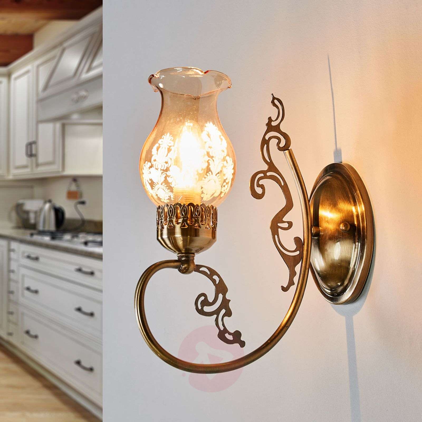 Wymyślny kinkiet Heti w antycznej stylistyce Heti bez wątpliwości należy do lamp utrzymanych w stylistyce klasycznej, a nawet antycznej, które zachwycają bogactwem detali. Wszystkie elementy lampy sprawiają wrażenie bardzo wymyślnych, ponieważ zdobione są esami-floresami i okrągłościami. Powierzchnia metalowej podstawy ma wykończenie z postarzanego mosiądzu, które do złudzenia przypomina prawdziwy mosiądz i świetnie pasuje do ogólnej koncepcji lampy. Szklany klosz w kształcie kielicha ma kolor bursztynowy i roztacza wyjątkowo piękny blask, wypełniający pomieszczenie przytulnością. Klasa efektywności energetycznej: A++