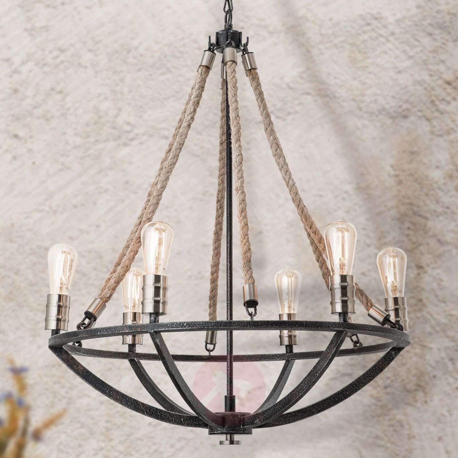 Rustykalny żyrandol Gita z linami Już bardziej pierwotnie być nie może: Żyrandol Gita o rustykalnym designie prezentuje się jak żyrandol z dawnych epok, z tą jednak różnica, że w jego oprawkach nie umieszczono prawdziwych świeczek, a nowoczesne źródła światła. Zaleca się dobór takich źródeł, które pasować będą do stylistyki żyrandola, tzn. źródeł utrzymanych w stylu vintage. Korpus żyrandola w dużym stopniu wykonany został z żelaza trawionego kwasem. Jego szorstka powierzchnia bardzo pasuje do antycznego designu całego żyrandola. Efekt antyku wzmacniają mocne konopne sznury, tworzące część korony żyrandola. Powierzchnie oprawek na źródła utrzymane są w kolorze postarzanego mosiądzu. Klasa efektywności energetycznej: A++