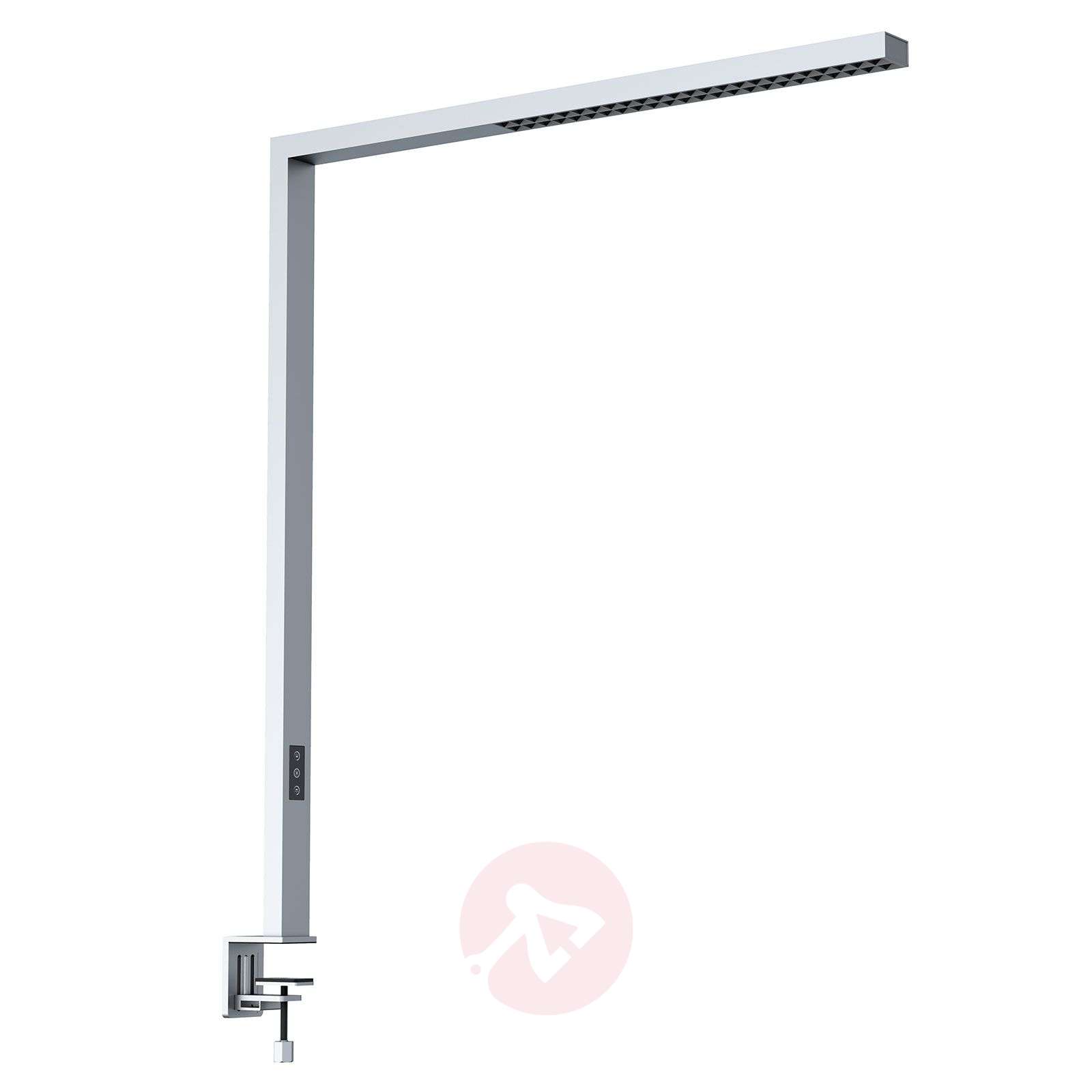 Srebrna lampa z klipsem LED biurowa Jolinda ze ściemniaczem dotykowym i bezpośrednim/pośrednim światłem Dzięki części zaciskowej do montażu na biurku w biurze lub w środowisku komercyjnym, lampa stołowa LED Jolinda jest swego rodzaju innowacją w dziedzinie oświetlenia biur. Diody LED o barwie uniwersalnej bieli - bardzo dobra barwa światła do pracy w biurze - emitują światło zarówno w górę, jak i w dół, przy czym większa część światła pośrednio przenika w górę pomieszczenia, tworząc w ten sposób bardzo naturalny efekt świetlny, dzięki któremu można się skoncentrować podczas pracy. Bezpośrednia część światła charakteryzuje się również tym, że praktycznie zminimalizowano oślepianie i że nie ma irytujących efektów świetlnych, którymi należy się martwić podczas pracy. Ponadto światło nie migocze, dzięki czemu uzyskuje się najlepszą jakość światła do skoncentrowanej pracy. Dane techniczne: - ściemnianie za pomocą panelu dotykowego na podstawie lampy - brak migotania - barwa światła uniwersalna biel ułatwia koncentrację podczas pracy - zintegrowana część zaciskowa z zaciskiem śrubowym do mocowania w miejscu pracy w biurze (dla grubości stołu od 1,5 cm do 7 cm) - nieoślepiające światło (UGR - bezpośrednie i pośrednie składowe światła - światło pośrednie w górę przy kącie padania światła 110° - światło bezpośrednie w dół przy kącie padania światła 50° - odporność na uderzenia IK06 Klasa efektywności energetycznej: A+