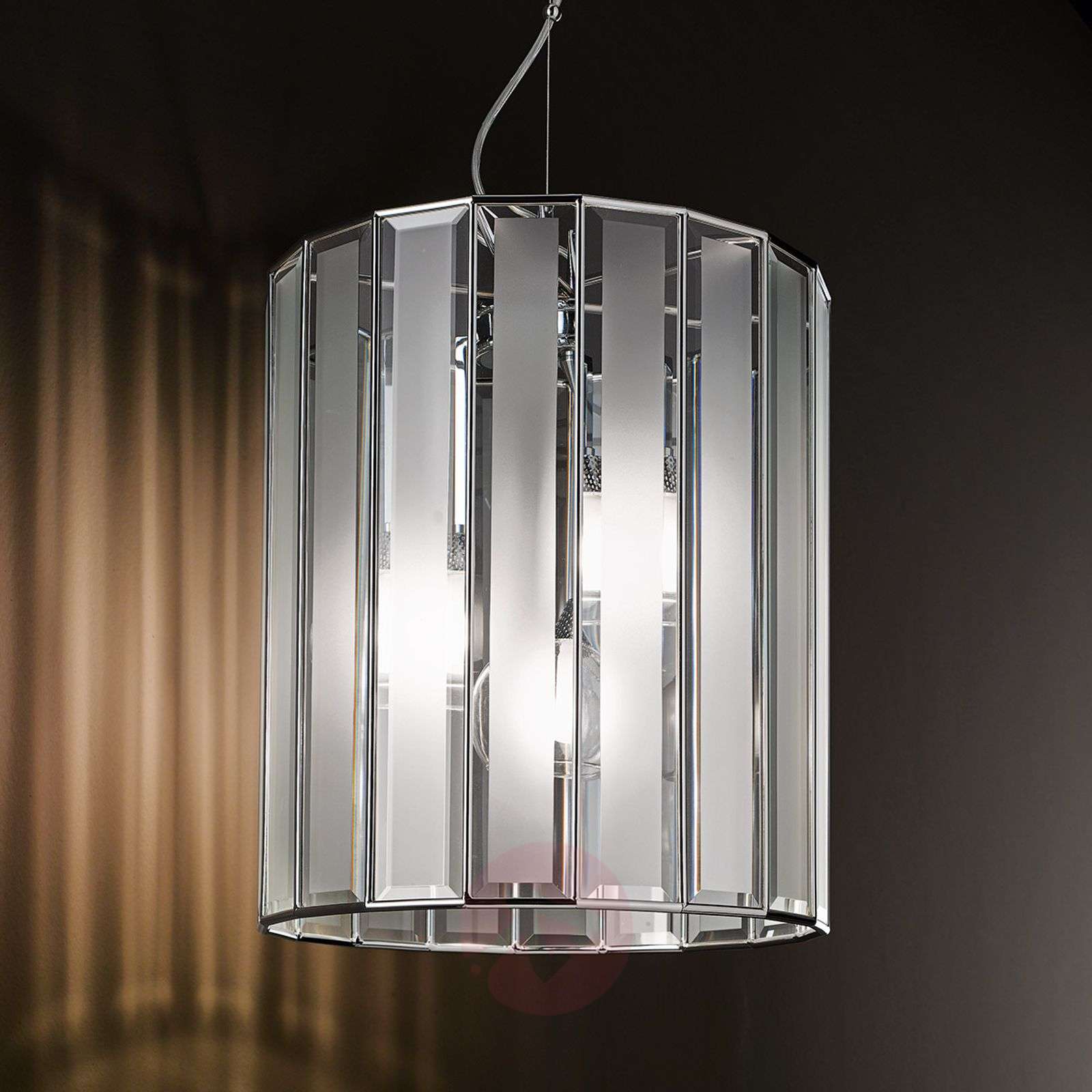 Okrągła lampa wisząca BUENA VISIONE z satynowym szkłem Wszystkie metalowe elementy, które tworzą okrągłą lampę wiszącą BUENA VISIONE, zostały wykonany z chromowanego metalu. Pięknie kontrastują z pięknymi, oszlifowanymi płytkami z satynowego szkła kryształowego. BUENA VISIONE znaczy tyle co „dobra widoczność” i rzeczywiście w jest to prawdą w przypadku tej lampy. Światło lampy halogenowej jest rozpraszane przez mały, satynowy klosz w kształcie rury, który jest otoczony okrągłą, przypominającą kieliszek do wina szklaną osłoną. Wokół zaś trzech umieszczonych wewnątrz na różnych wysokościach podwójnych kloszy zawieszona jest konstrukcja z podłużnych szybek z satynowego szkła o pięknym szlifie, które przypominają lampy w stylu Tiffany lub witraż. Ekskluzywne produkty tej marki są wykonywane ręcznie wyłącznie we Włoszech ze starannie dobranych, wysokiej jakości materiałów. W ten sposób firma pragnie także nawiązywać do długiej tradycji weneckiej sztuki tworzenia lamp, z pasją i najwyższą starannością tworząc produkty o osobliwych cechach, które świadczą o ich wyjątkowości i oryginalności. Klasa efektywności energetycznej: D