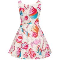 Sukienka różowa dla dziewczynki z satyny i organzy, w nadrukowane lizaki i cukierki.