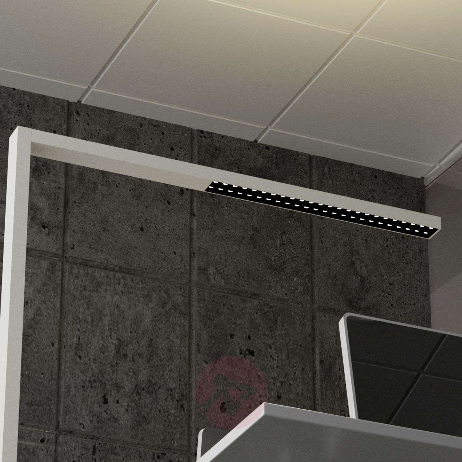 Ściemniana biurowa lampa stojąca LED Jolinda z białym wykończeniem i wąską konstrukcją Biurowa lampa stojąca LED Jolinda wyróżnia się bardzo wąską, kanciastą i pozbawioną detali formą, dlatego jej wygląd wspaniale komponuje się z purystycznymi stylami wyposażenia wnętrz, które zyskują coraz większą popularność w profesjonalnych przestrzeniach biurowych. Światło LED jest skierowane zarówno w górę, jak i w dół, dzięki czemu powstaje kombinacja światła pośredniego i bezpośredniego zapewniająca naturalne, łagodne oświetlenie pomieszczenia. Światło skierowane w dół praktycznie nie oślepia, umożliwia więc spokojną pracę przy maksymalnej koncentracji. Ściemniacz obrotowy służący do indywidualnej regulacji natężenia oświetlenia znajduje się w połowie wysokości podstawy i umożliwia idealne dostosowanie światła do konkretnych potrzeb. Stabilna stopa w formie litery „U”. - UGR Klasa efektywności energetycznej: A+