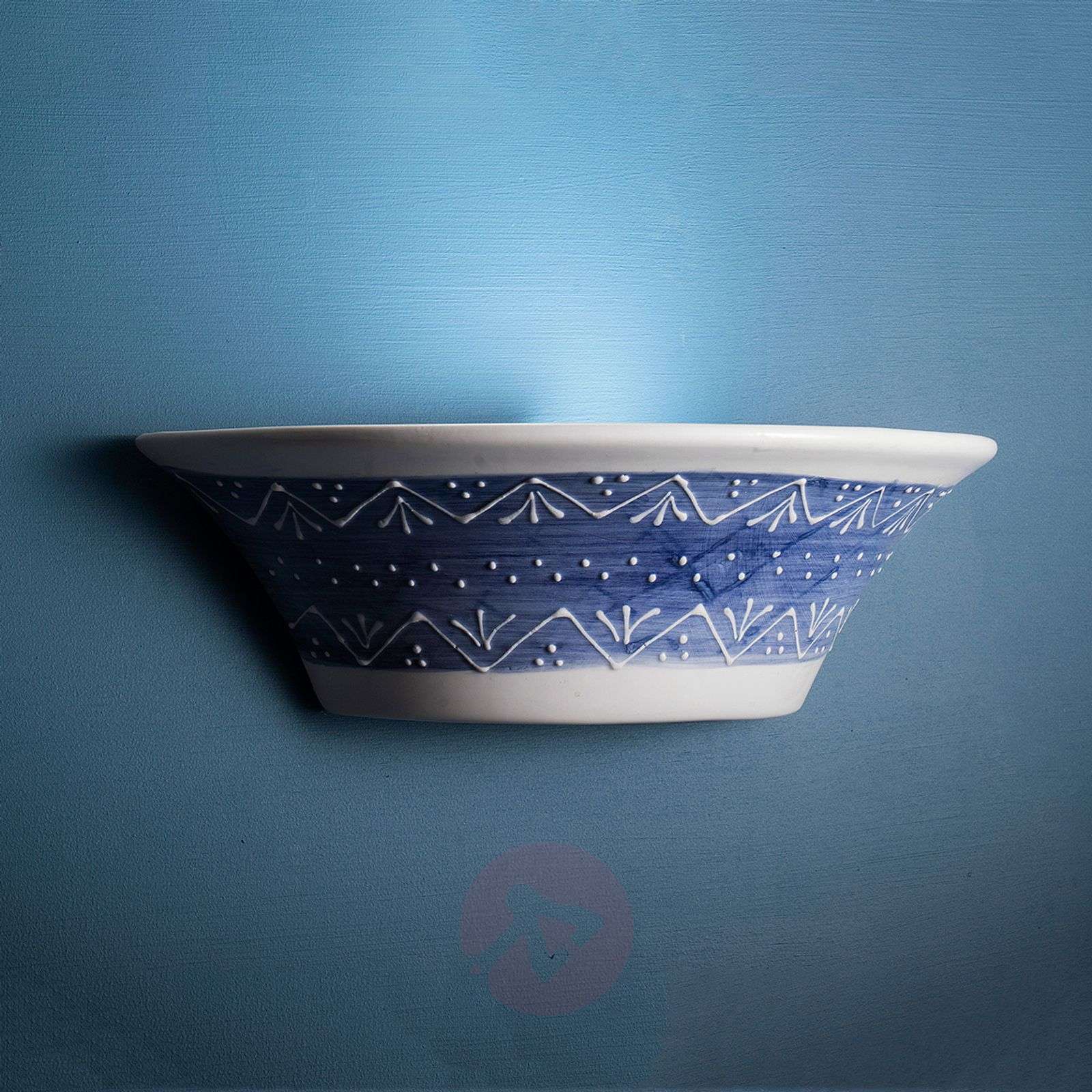 Ceramiczna lampa ścienna Nelli - uniwersalne źródło światła Lampa ścienna Nelli urzeka filigranowym wzorem na korpusie ceramicznym. Drobne białe linie i kropki zdobią przeważnie niebieską podstawę lampy. Forma, materiał i wzór wyróżniają Nelli jako szczególnie dekoracyjny dodatek oświetleniowy w stylowo urządzonych mieszkaniach w stylu śródziemnomorskim. Klasa efektywności energetycznej: A++