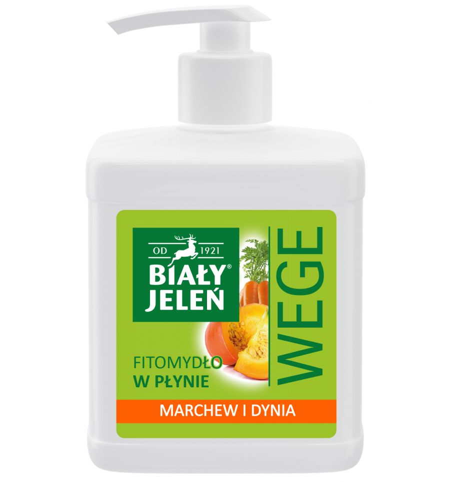 Biały Jeleń FITOmydło w płynie marchew i dynia Wegańskie fitomydło w płynie oparte na delikatnych składnikach myjących oraz naturalnych ekstraktach z marchwi i dyni.