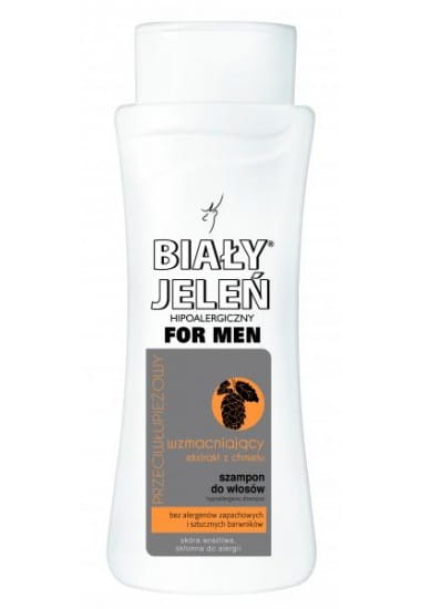 Hipoalergiczny szampon Biały Jeleń dla mężczyzn z chmielem został opracowany specjalnie dla osób z dolegliwościami alergicznymi, mających problem z przetłuszczającymi się włosami i skłonnością do łupieżu.Receptura została oparta na naturalnych i bezpiecznych środkach myjących tak, aby najwłaściwiej pielęgnować włosy. Specjalnie dobrane substancje aktywne pomagają zwalczać łupież i działają antyłojotokowo. Nie zawiera alergenów i sztucznych barwników. Szampon Biały Jeleń nie szczypie w oczy.Produkt przebadany wśród osób z alergiami skórnymi.Zawiera:• aktywny kompleks przeciwłupieżowy zawierający związki siarki działające antyłojotokowo oraz pirokton olaminy hamujący rozwój grzybów odpowiedzialnych za powstawanie i objawy łupieżu,• proteiny pszeniczne ułatwiające rozczesywanie,• ekstrakt z chmielu o właściwościach przeciwłojotokowych i wzmacniających.